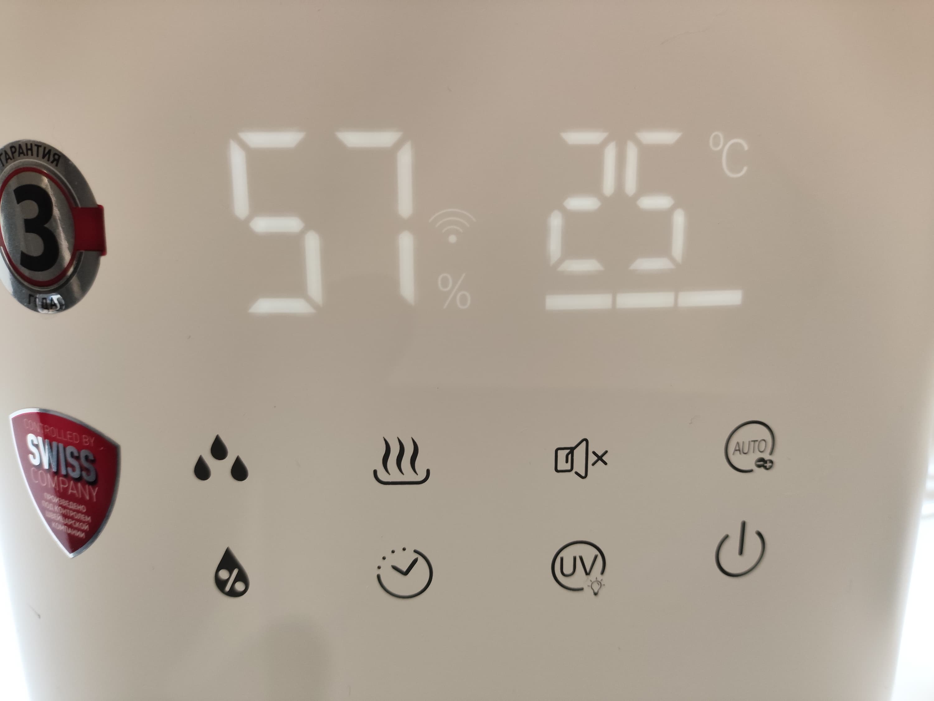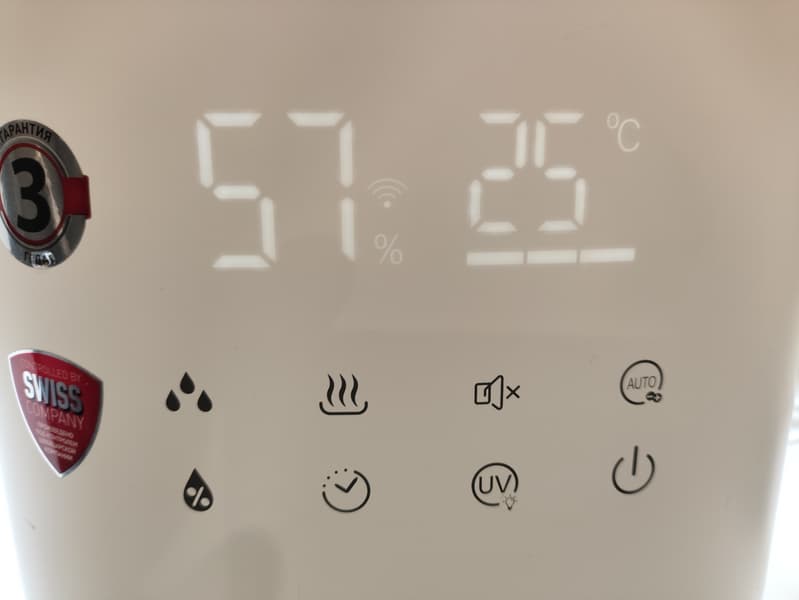 В рабочем состоянии на дисплее отображается текущий уровень влажности, температура и выбранная интенсивность увлажнения (одна, две или три полоски под крупными цифрами). Для каждого из дополнительных режимов имеется соответствующая иконка, которая горит или не горит в зависимости от того, активен ли данный режим в данный момент. Также тут можно найти иконку Wi-Fi-подключения и красную иконку, которая загорится, когда в баке закончится вода.