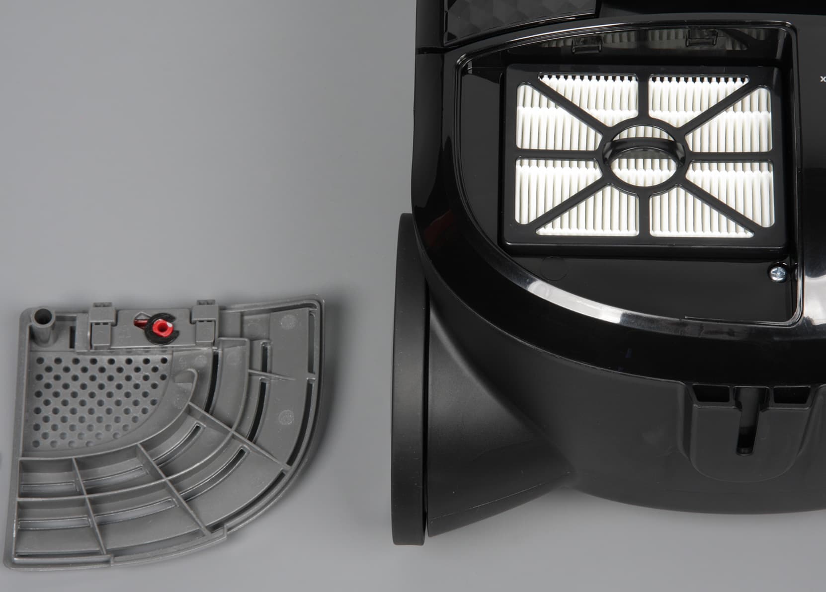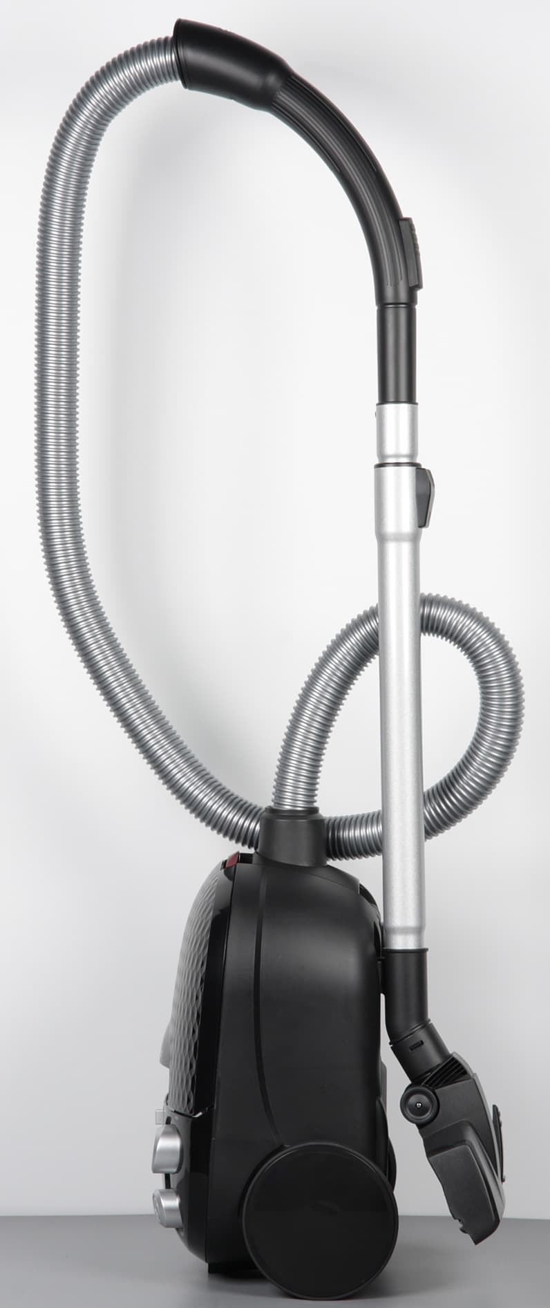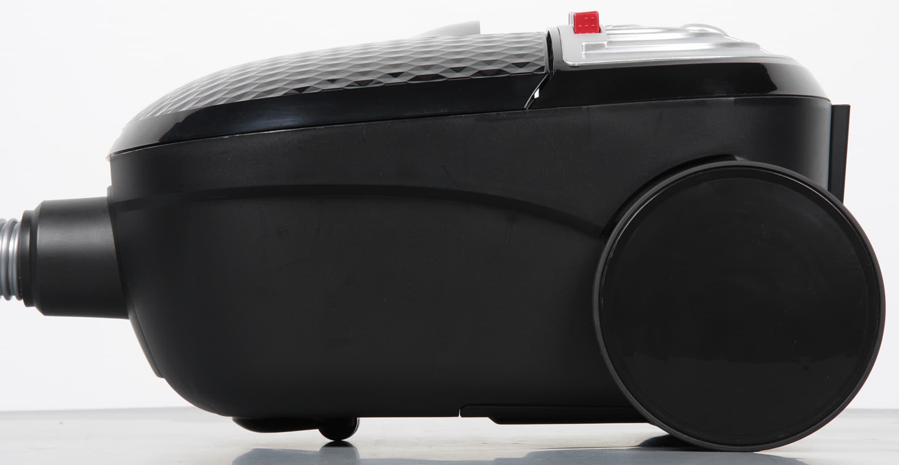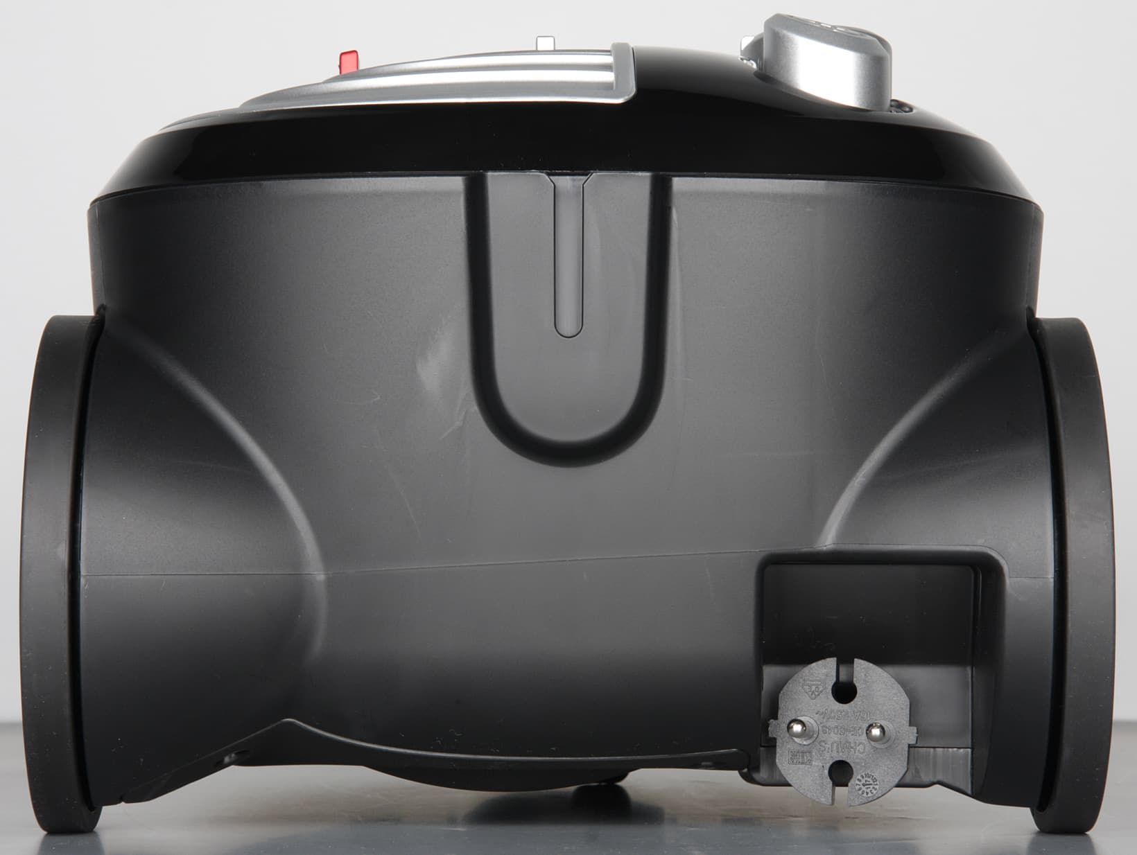 Дизайн практичный, а сочетание цветов можно назвать классическим — черный и серебристый. Корпус пылесоса и аксессуары изготовлены в основном из пластика. Чаще всего применяется черный без покрытия пластик с матовой поверхностью, но внешние плоскости колес и верхняя часть корпуса моторного блока имеет зеркально-гладкую поверхность, при этом внимание привлекает геометрический рельефный узор на крышке отсека для мешка. Кнопки на корпусе и крышка выпускного фильтра — с матовым серебристым покрытием, а фиксаторы двух крышек корпуса моторного блока — с темно-красным серебристым покрытием.