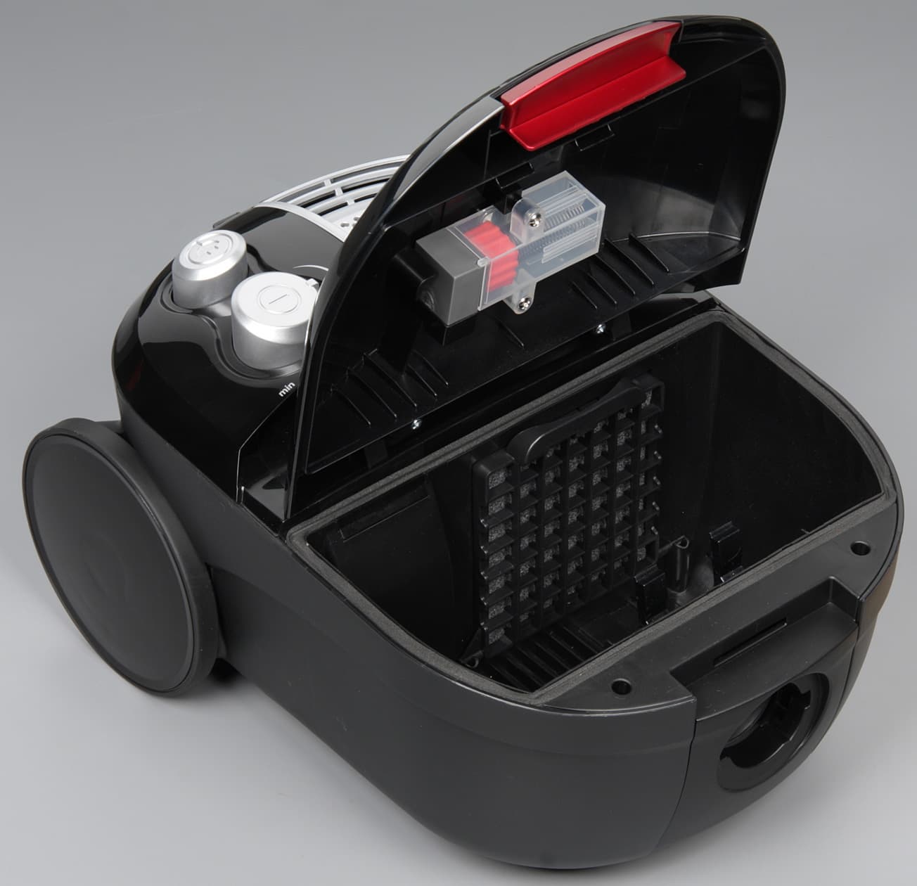 Потянув за красный фиксатор, крышку отсека для мешка можно откинуть вверх. Она фиксируется в открытом положении, чтобы удобнее было извлекать мешок. Сверху изнутри на крышке закреплен предохранительный перепускной клапан, он же является индикатором засора или переполнения мешка: красный корпус клапана появляется в окошке сверху на крышке, когда разрежение достигает критической величины.