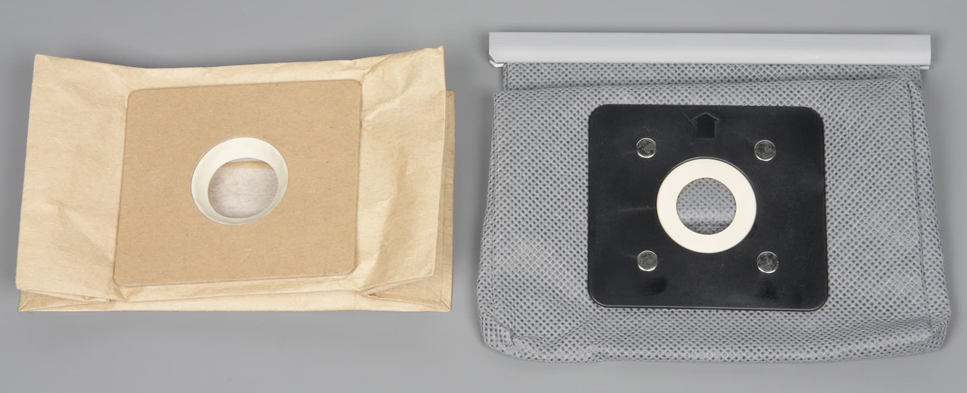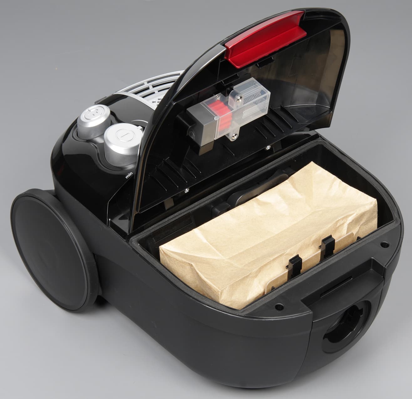 Рамка мешка двумя рычажками прижимается к короткому патрубку входного отверстия. Без вставленного мешка (вернее без установленной на месте рамки мешка) крышка не закрывается. Рамка одноразового бумажного мешка изготовлена из картона и имеет уплотнительное кольцо из тонкой резины. В комплекте есть и многоразовый матерчатый мешок. Его рамка уже из прочного пластика и резиновое кольцо на ней из более толстой резины. С противоположной от рамки стороны подшитые края мешка зажимает пластиковая планка, которую нужно сдвинуть вбок, чтобы открыть мешок. Это практичнее, чем застежка «молния», применяемая иногда в многоразовых мешках.