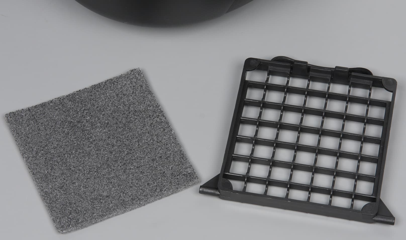 Отсоединяемая решетка удерживает волокнистый предмоторный фильтр на входном отверстии вентилятора.