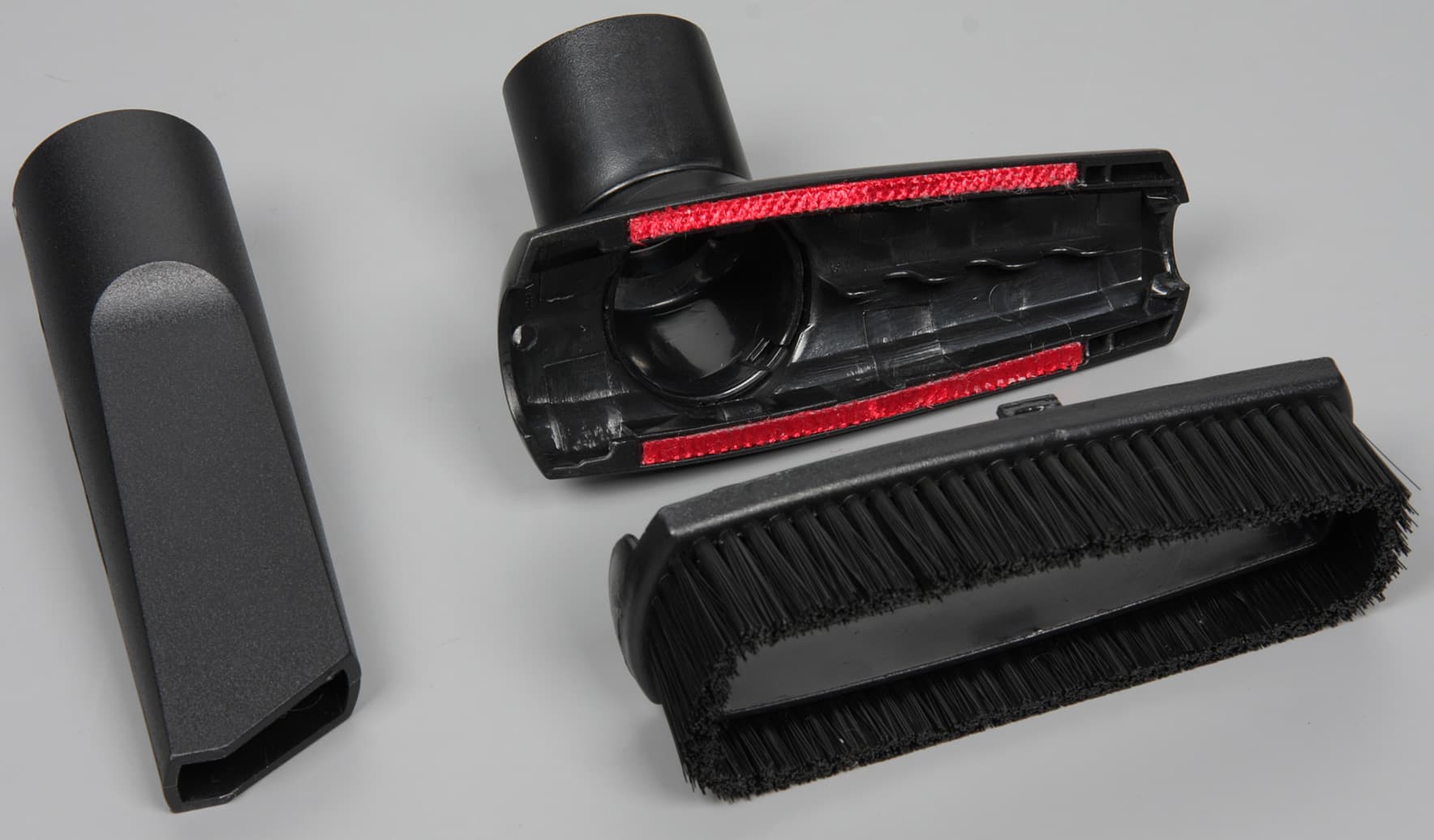 К пылесосу прилагается типичная короткая щелевая насадка и комбинированная насадка со съемной рамкой со щетиной. С ней — это небольшая универсальная щетка, без нее — насадка для чистки мягкой мебели. Насадка асимметричная, а ее горизонтальная часть может проворачиваться относительно патрубка с фиксацией под некоторыми углами.