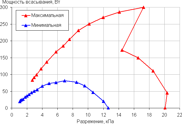 Инструментальные тесты в основном заключались в определении мощности всасывания и измерении уровня шума. Мощность всасывания (что это такое и как мы ее измеряем описано в отдельной статье) мы определяли при работе пылесоса на максимальной и на минимальной мощности. Зависимость мощности всасывания от создаваемого разрежения приведена на графике ниже (с одноразовым мешком):