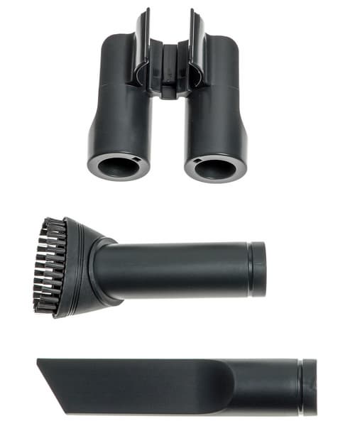 В комплект пылесоса входит держатель для двух насадок. Его можно закрепить на ручке шланга или телескопической трубке так, чтобы щелевое сопло и щетка для мебели всегда находились под рукой при уборке. Заметим, чуть забегая вперед, что при практическом тестировании прибора мы обнаружили ошибку на фотографии выше: держатель следует размещать не так, как это сделал фотограф, а в обратном положении, иначе есть риск, что насадки выпадут из посадочных мест.
