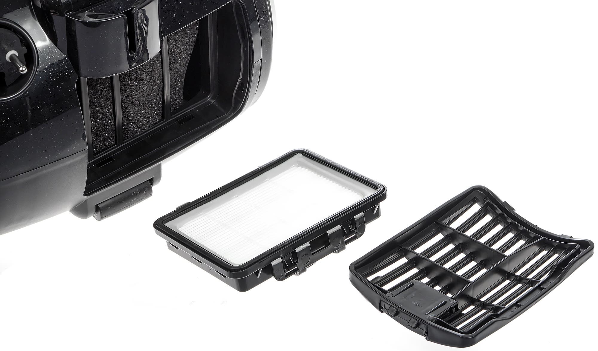 Под решеткой выпускного фильтра расположен прямоугольный HEPA-элемент в пластиковой рамке.