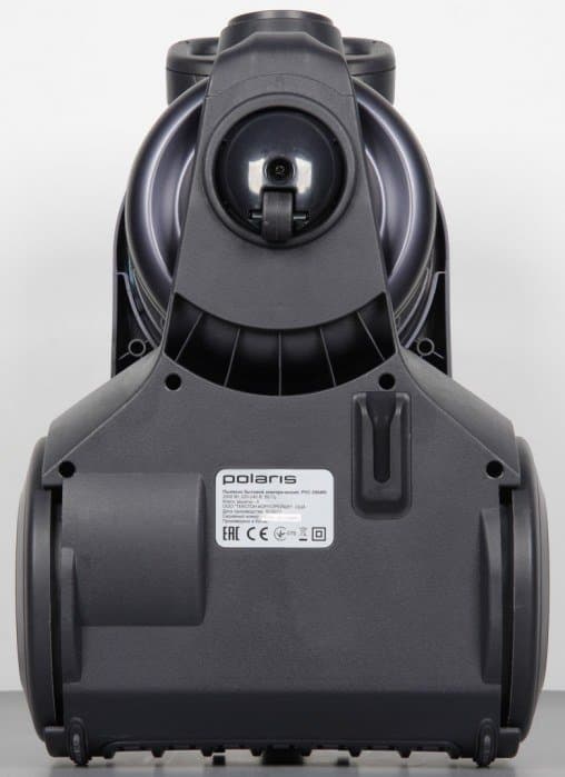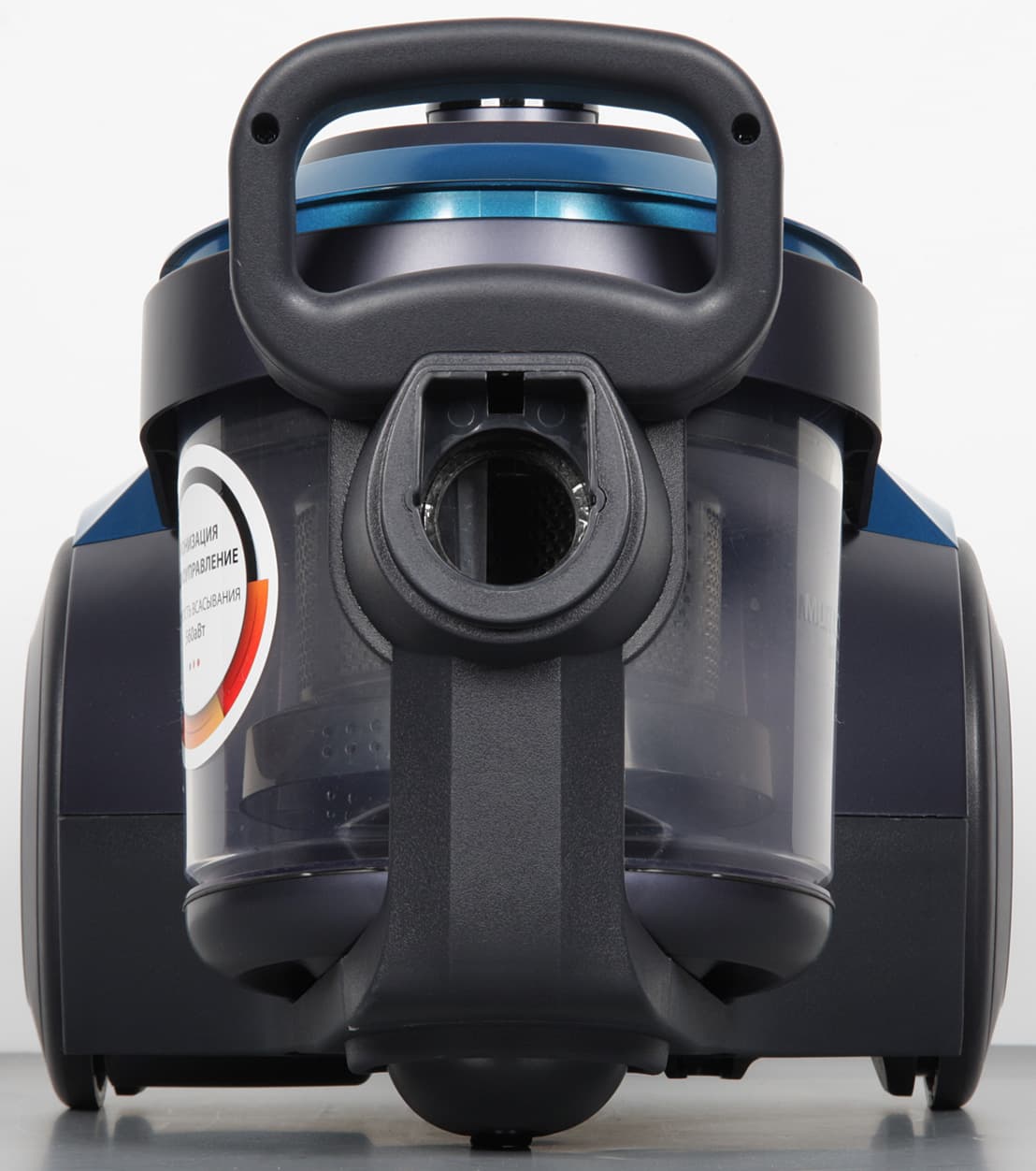 По бокам сверху в задней части есть две педали: левая — включает-выключает пылесос, правая — снимает блокировку кабельной катушки. Согласно нашим замерам длина кабеля составляет 4,9 м. Между педалями — вставка из прозрачного плотно тонированного пластика, за которой расположены индикаторы подключения к сети, текущей мощности, засора фильтра и работы ионизатора воздуха. Индикаторы синие, неяркие, различать их сложно.