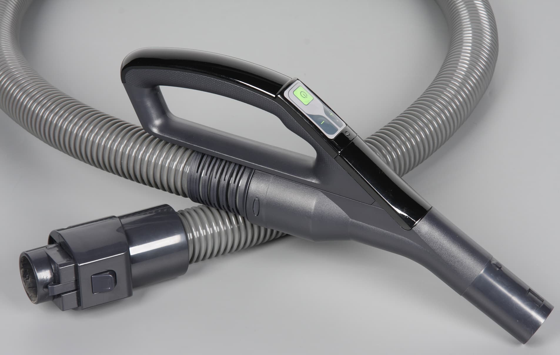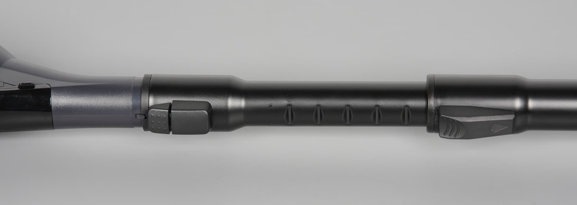 Труба к насадкам стыкуется плотной посадкой на конус, а на рукоятке трубу удерживает замковый фиксатор. Наконечник гибкого шланга к входному отверстию пылесоса подключается в определенной ориентации и фиксируется пластиковой защелкой. Гибкий шланг свободно проворачивается как в наконечнике, так и в рукоятке.