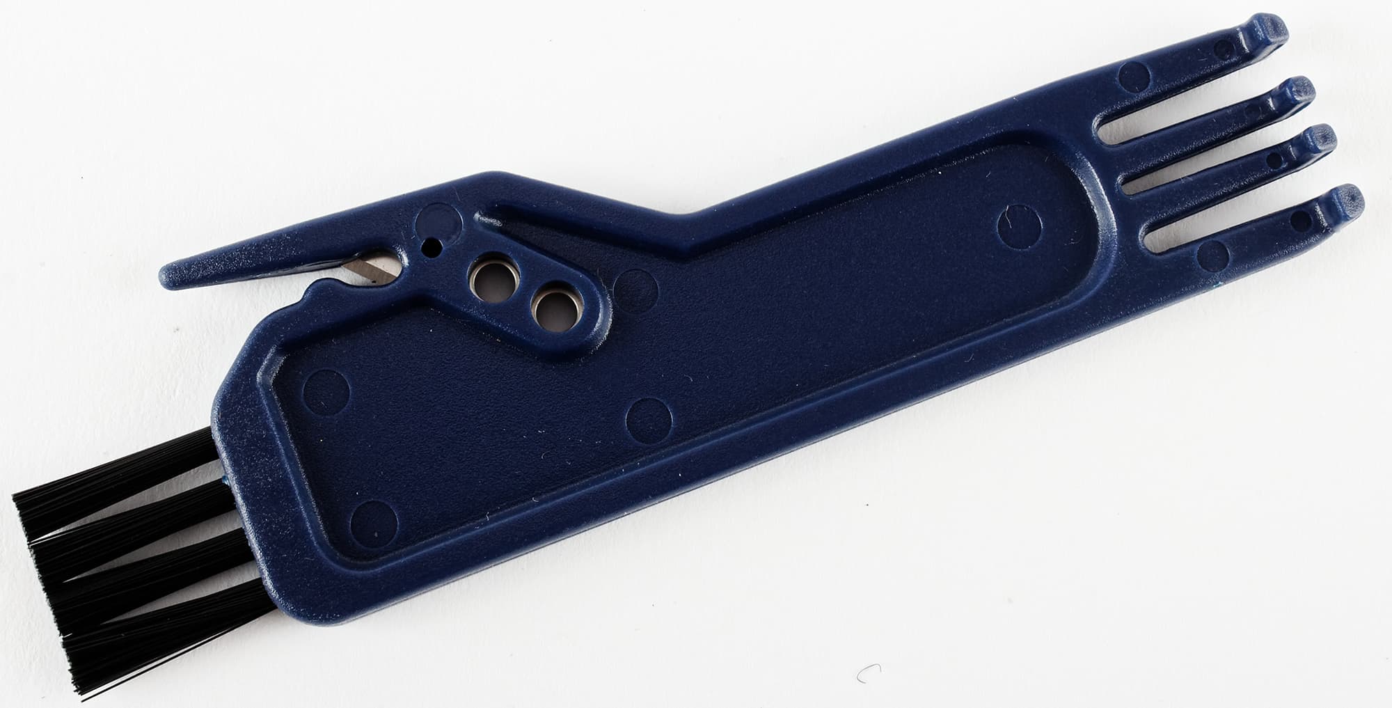 Пылесос комплектуется также чистящим приспособлением, состоящим из «расчески» для очистки HEPA-фильтра, щеточки и лезвия для срезания с электрощетки ниток, волос и длинной шерсти домашних животных.