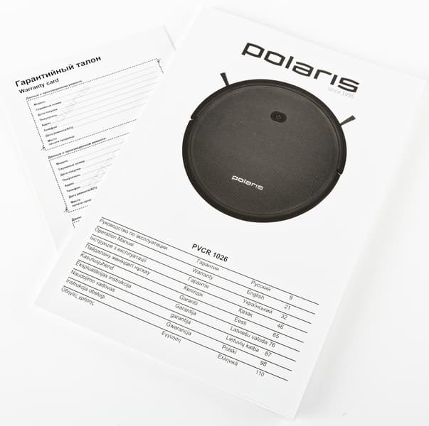 Инструкция к роботу-пылесосу Polaris PVCR-1026 — толстая брошюра формата А5 на плотной глянцевой бумаге. Она включает в себя руководство по эксплуатации и гарантийные условия на девяти языках: русском, английском, украинском, казахском, эстонском, латвийском, литовском, польском и греческом.