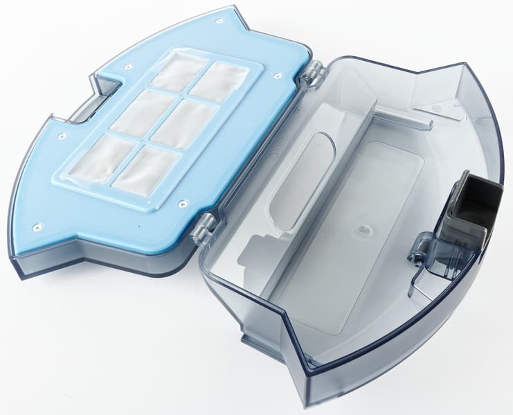 Модуль пылесборника фиксируется в корпусе устройства при помощи защелки в задней части. Его верхняя крышка может полностью открываться для очистки.