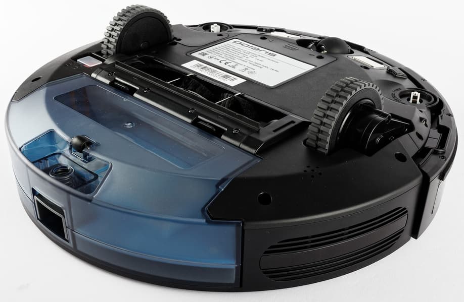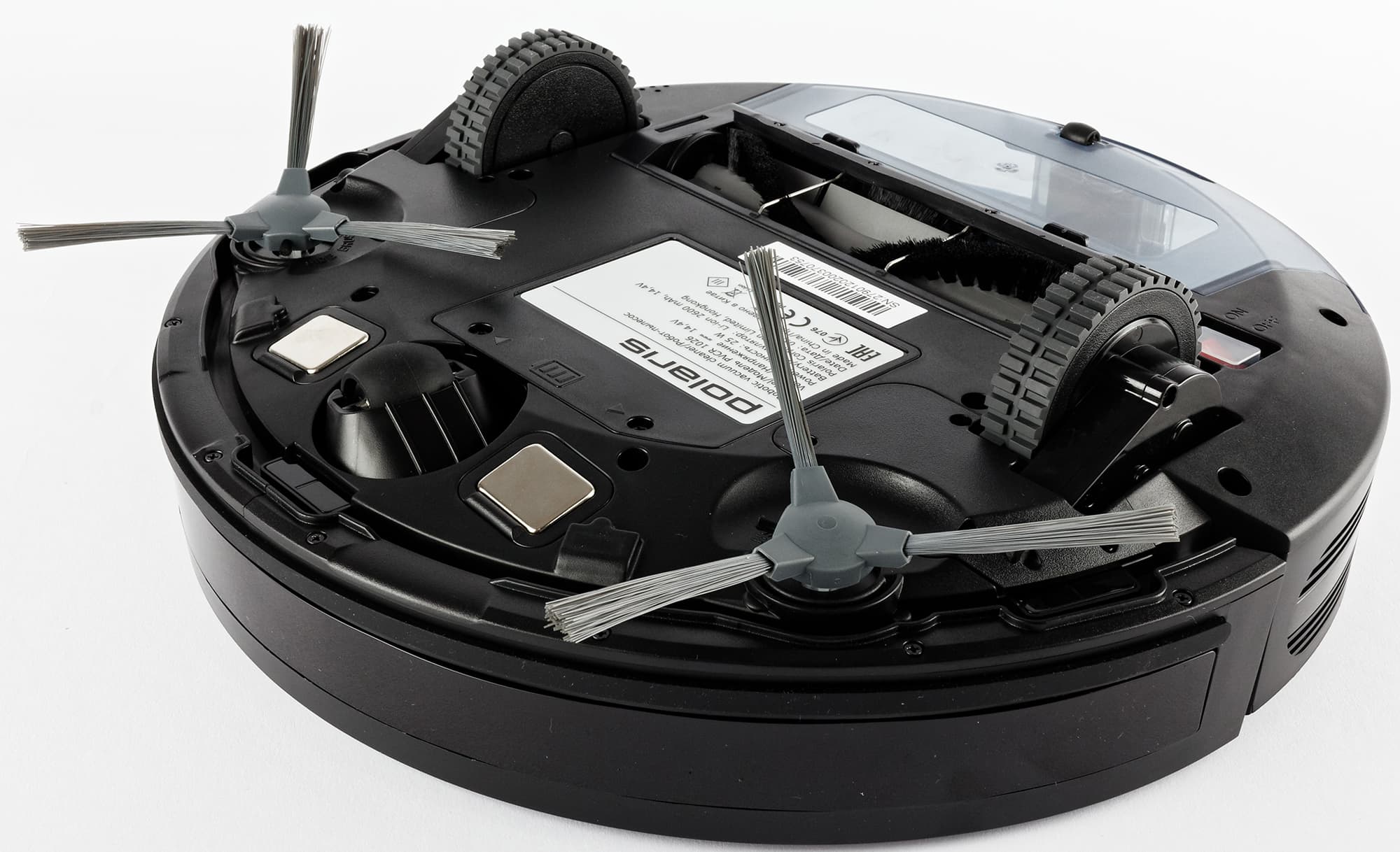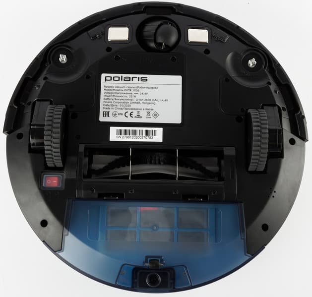По обе стороны направляющего колеса размещены два контакта, обеспечивающих зарядку на базе. Рядом с ними — гнезда для крепления боковых щеток. По периметру передней части дна расположены окошки трех оптических (инфракрасных) датчиков поверхности.