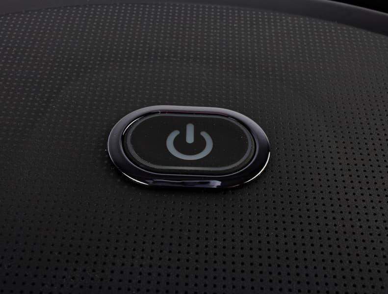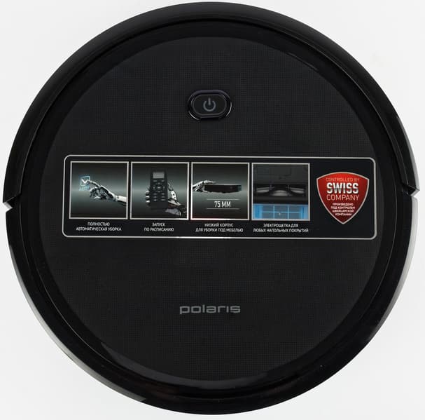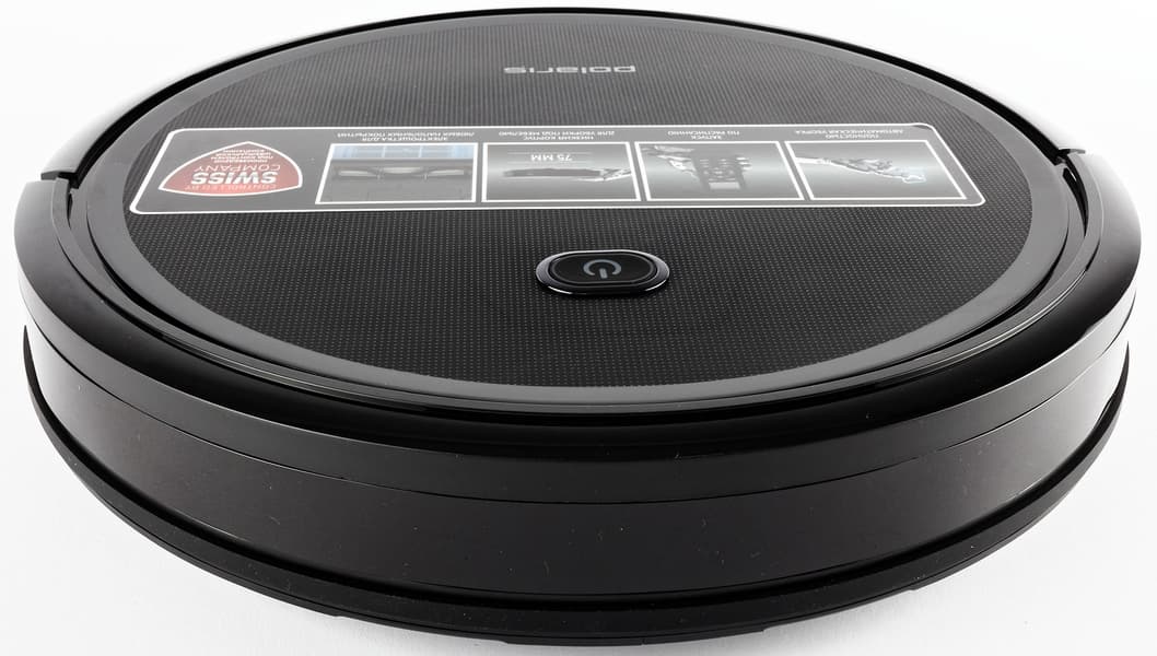 Верхняя панель робота-пылесоса Polaris PVCR-1026 выглядит просто, но изящно: ее покрытие сделано из приятной на ощупь мелкоячеистой пластиковой сетки, под которой расположена подложка с легким зеркальным эффектом. На панели есть только кнопка управления устройством и логотип производителя.