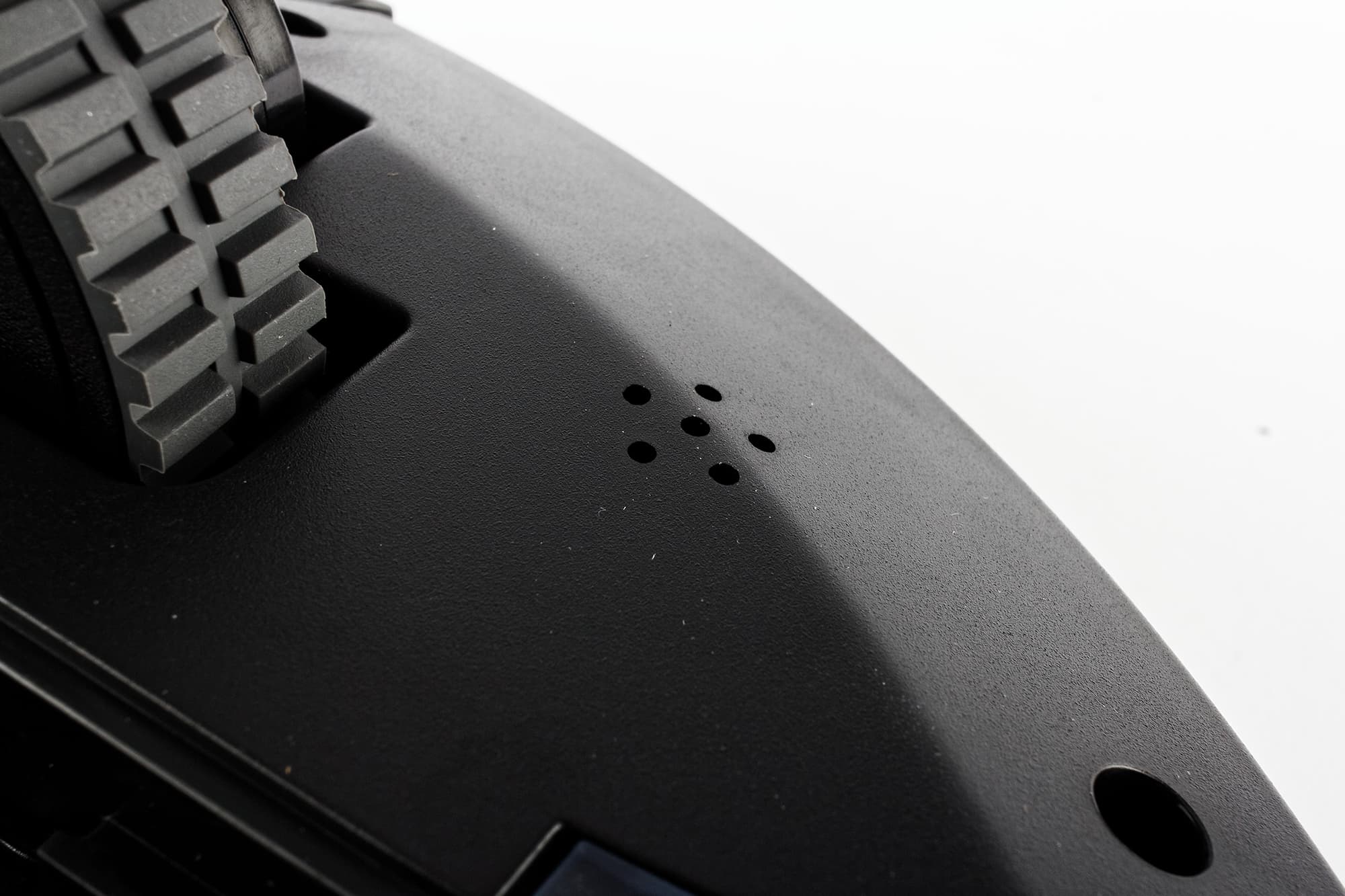 Всасывающий мотор прибора находится внутри корпуса. Решетка для выхода воздуха расположена на левой боковой стороне устройства. Похожая есть справа, но у нее нет сквозных отверстий — она декоративная.