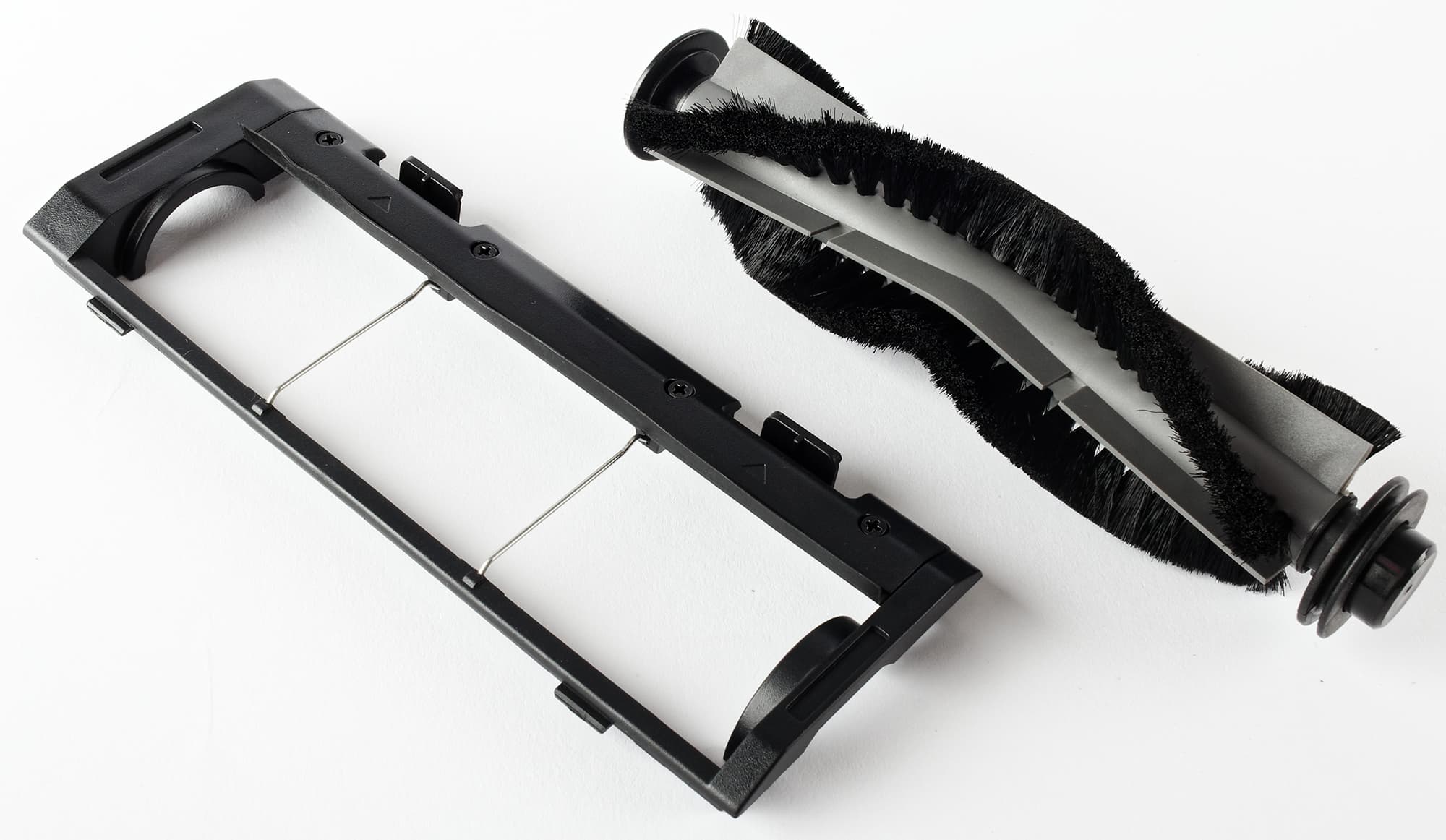 Крепится щетка пластиковой рамкой с двумя защелками, в задней части которой есть резиновая полоса: она улучшает прилегание к поверхности и облегчает всасывание мусора. Поперек гнезда есть два тонких стальных прутка, предотвращающими случайное наматывание на ротор электропроводов, — защита Roll Protect. Перепутать положение щетки при установке невозможно: пазы справа и слева различаются по конструкции.
