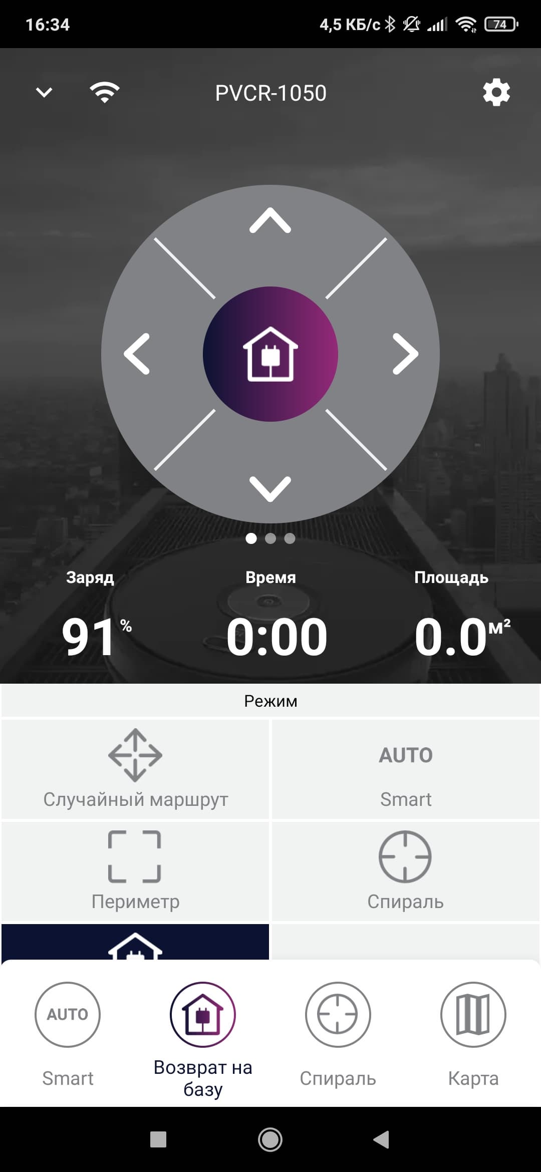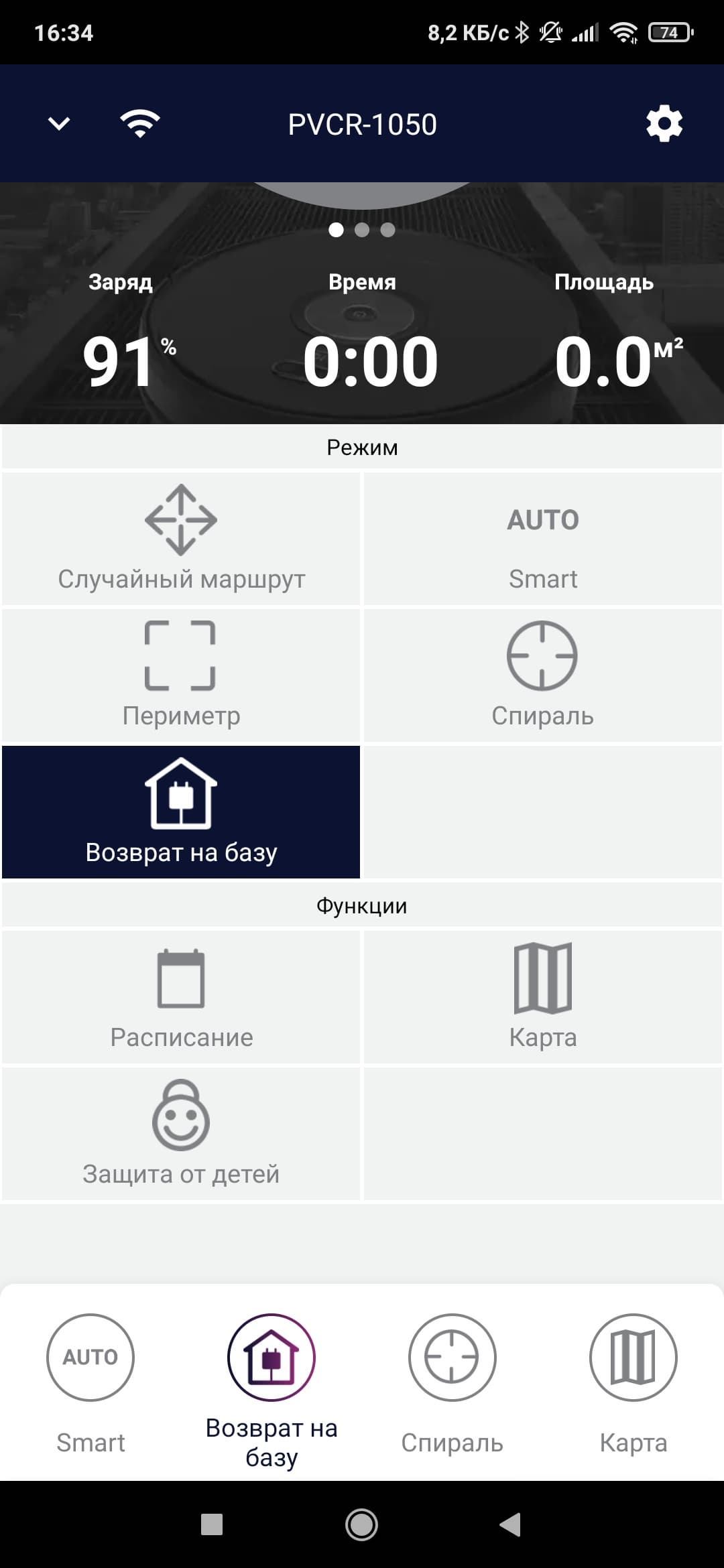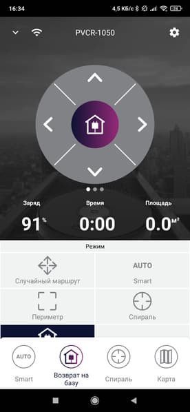 На основном экране мы получаем доступ к «пульту управления», практически полностью дублирующим обычный ИК-пульт. Тут же можно проверить текущий заряд батареи и узнать, сколько времени прошло с начала уборки.