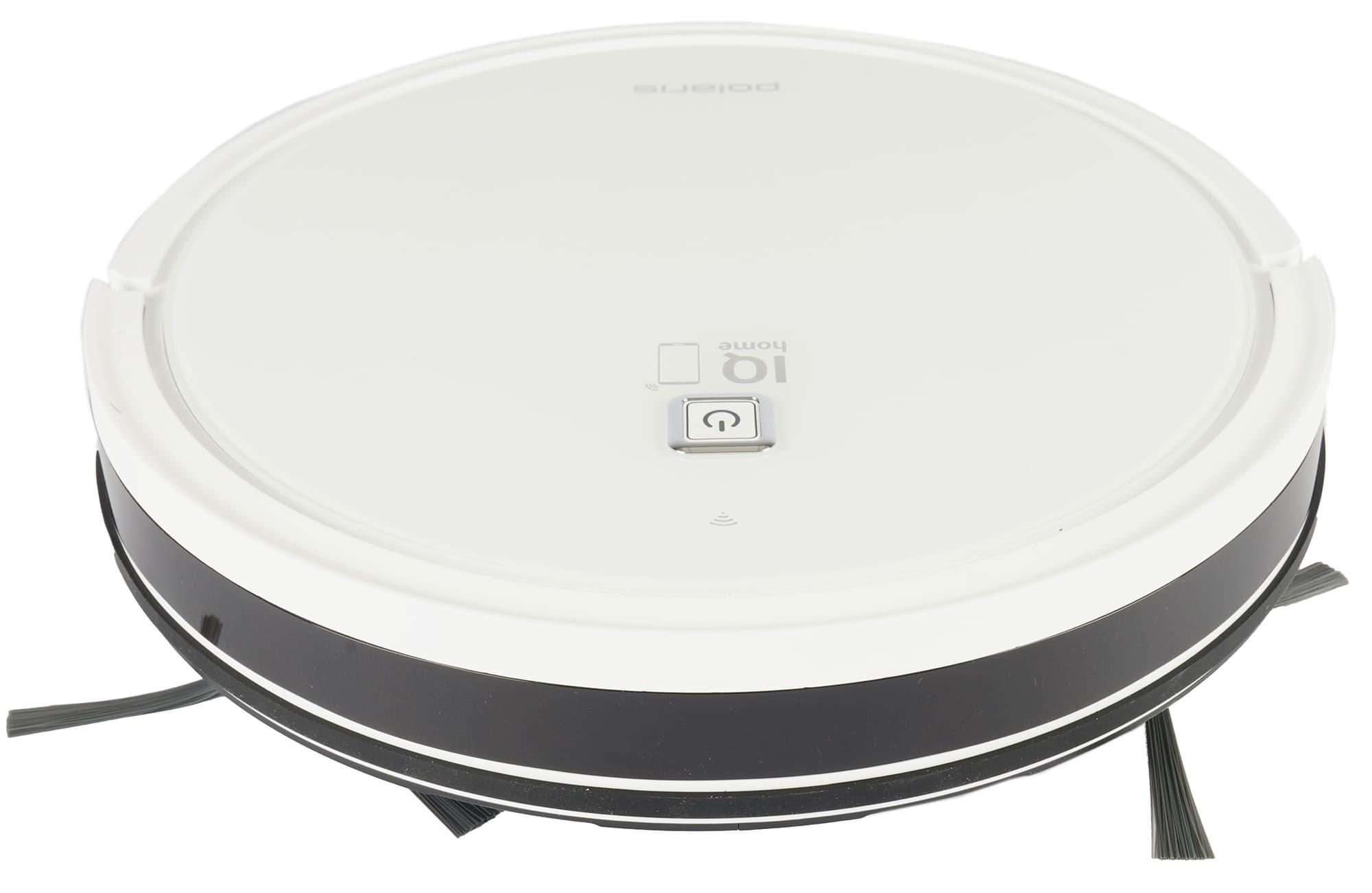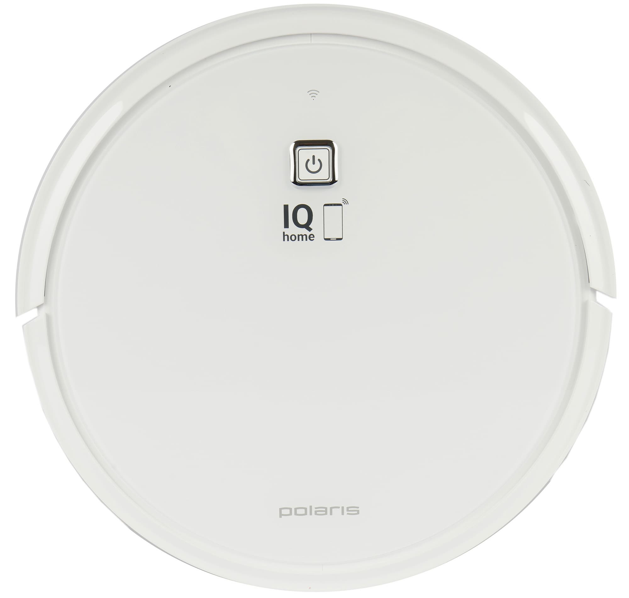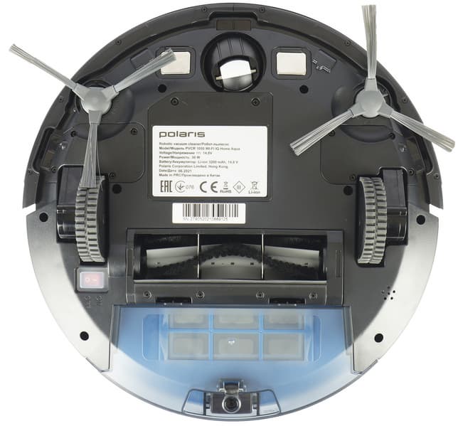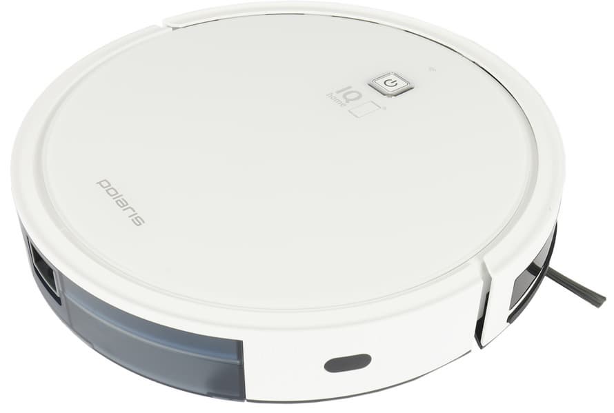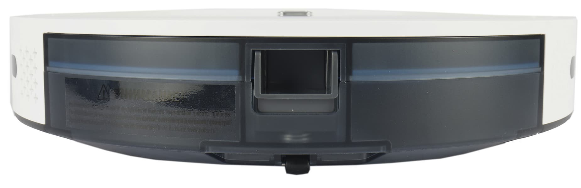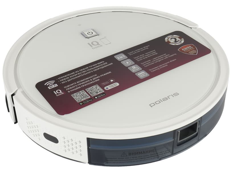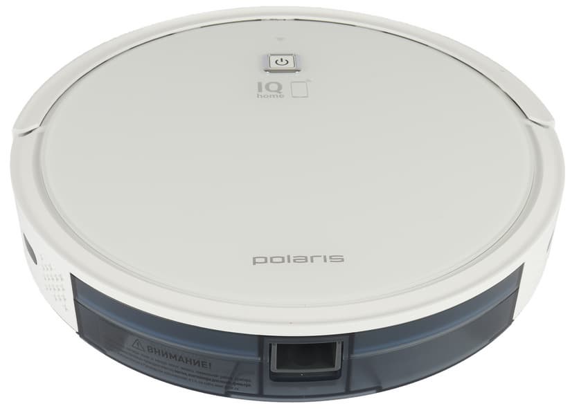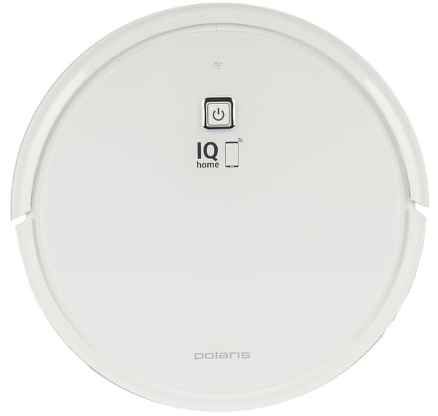 В верхней части робота, на глянцевой стеклянной панели, находится единственная кнопка управления со светодиодной подсветкой и светодиодный значок подключения к Wi-Fi. Ниже мы видим логотип IQ Home, наклейку с дополнительной информацией (ее нужно будет снять), а в самом низу — логотип Polaris.