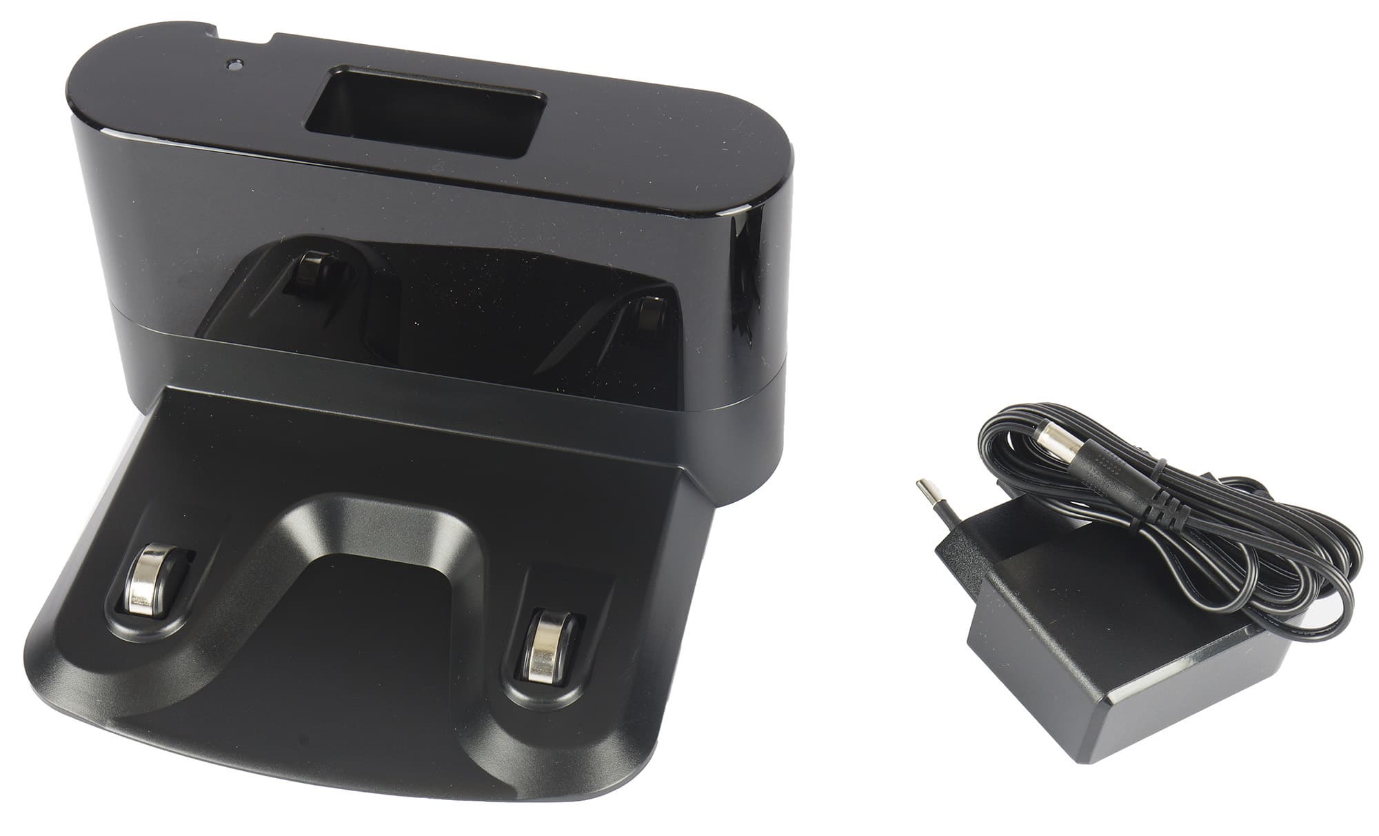 Верхняя часть пластиковой базы выполнена из ИК-прозрачного пластика, под которым стоят датчики, обеспечивающие позиционирование робота при возвращении на зарядку. У базы есть светодиод, сигнализирующий о ходе заряда батареи. Контакты подпружинены и имеют ход около 3 мм. Снизу у базы наклеены резиновые наклейки, препятствующие скольжению. С тыльной стороны имеется отсек, куда можно спрятать излишки шнура.