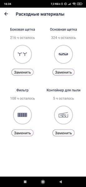 В приложении можно фиксировать этапы обслуживания устройства — время очистки контейнера для пыли, очистки фильтра, замены боковой или основной щетки, после чего на экране смартфона можно будет следить за износом расходных материалов (вычисляется в рабочих часах) и примерно понять, когда они потребуют внимания пользователя.