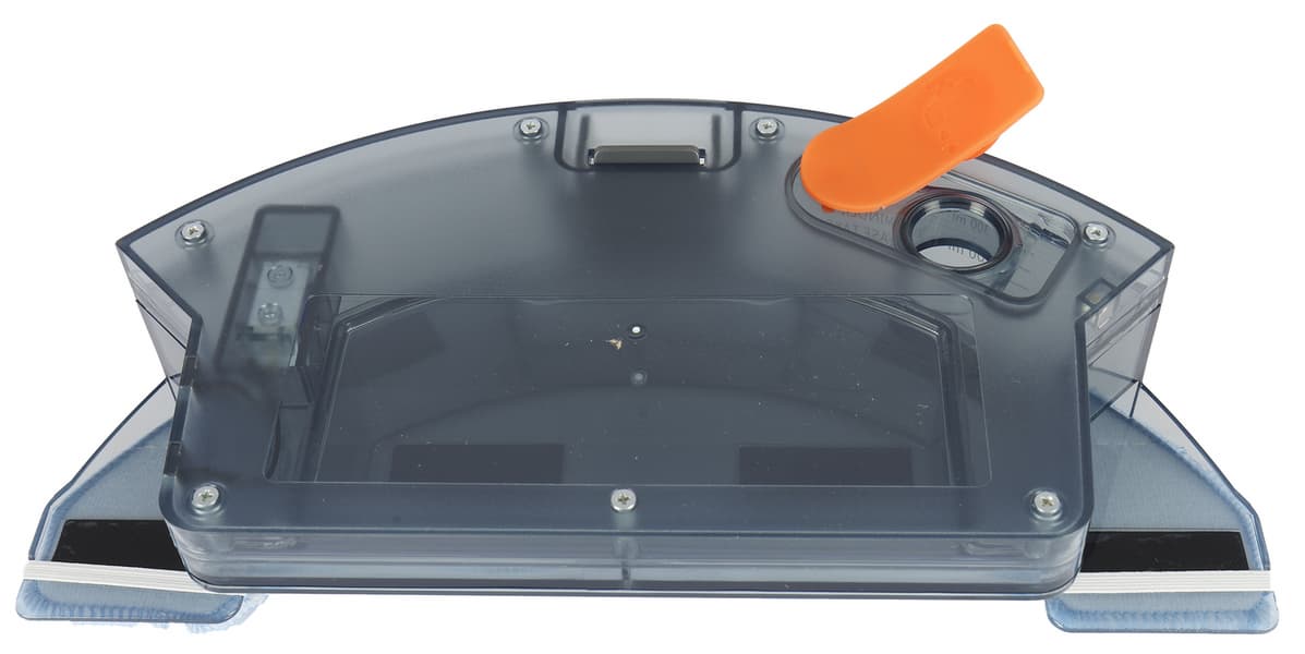 Контейнер для влажной уборки также оказался стандартным и ничем нас не удивил. Он (как и контейнер для пыли) фиксируется на корпусе прибора с помощью кнопки-защелки. С верхней стороны мы также видим резиновую пробку, закрывающую отверстие для залива воды. Сбоку нанесена градуировка — 100, 200 и 300 мл.