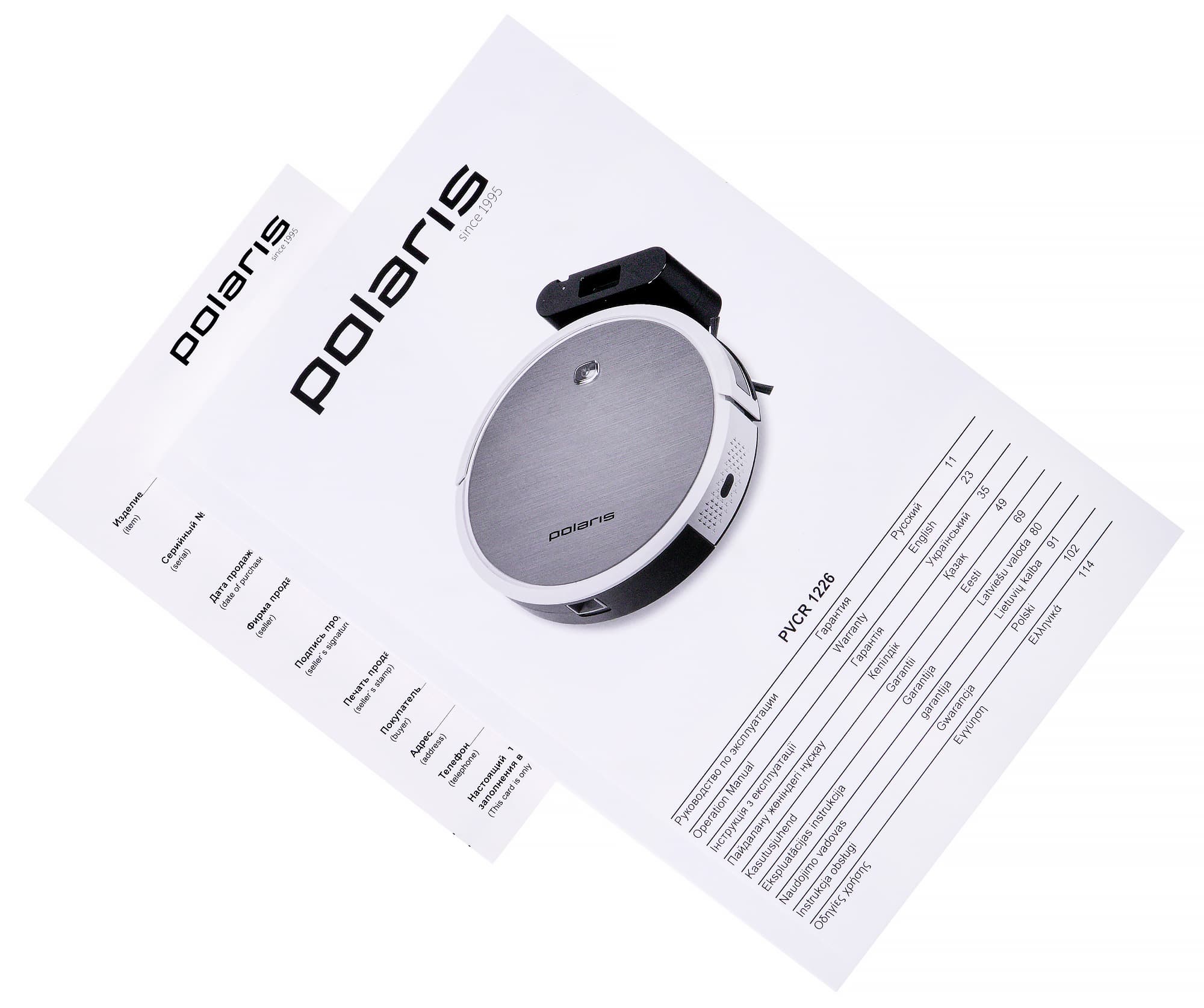 Руководство пользователя робота-пылесоса Polaris PVCR-1226 — довольно толстая (125 страниц) брошюра формата А5 на плотной глянцевой бумаге. Оно включает в себя инструкцию и гарантийные условия на девяти языках: русском, английском, украинском, казахском, эстонском, латвийском, литовском, польском и греческом.