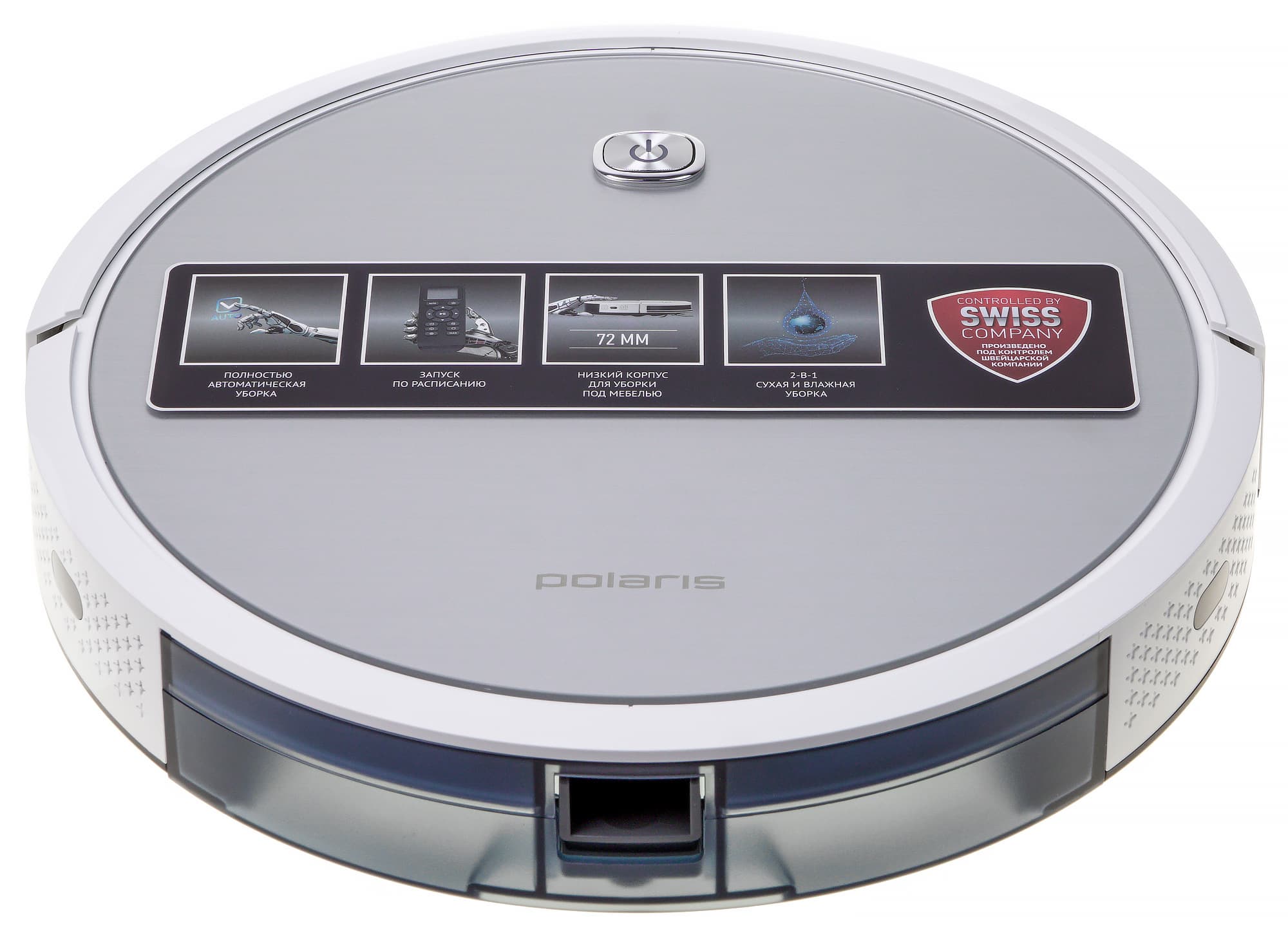 При взгляде сверху робот-пылесос Polaris PVCR-1226 выглядит строго, если не сказать — аскетично. На верхней стеклянной панели выделяется единственная кнопка управления, чуть ниже размещен логотип производителя. Под панелью находится серебристая матовая подложка, дающая небольшой зеркальный эффект.