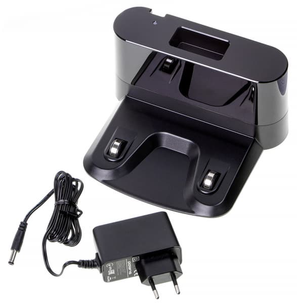Верхняя часть базы выполнена из ИК-прозрачного пластика, под которым стоят датчики, обеспечивающие позиционирование робота при возвращении на зарядку. У базы есть светодиод, сигнализирующий о ходе пополнения батареи, и гнездо, в котором может размещаться пульт управления прибором. Ее контакты сделаны в виде подпружиненных роликов с ходом около 5 мм.