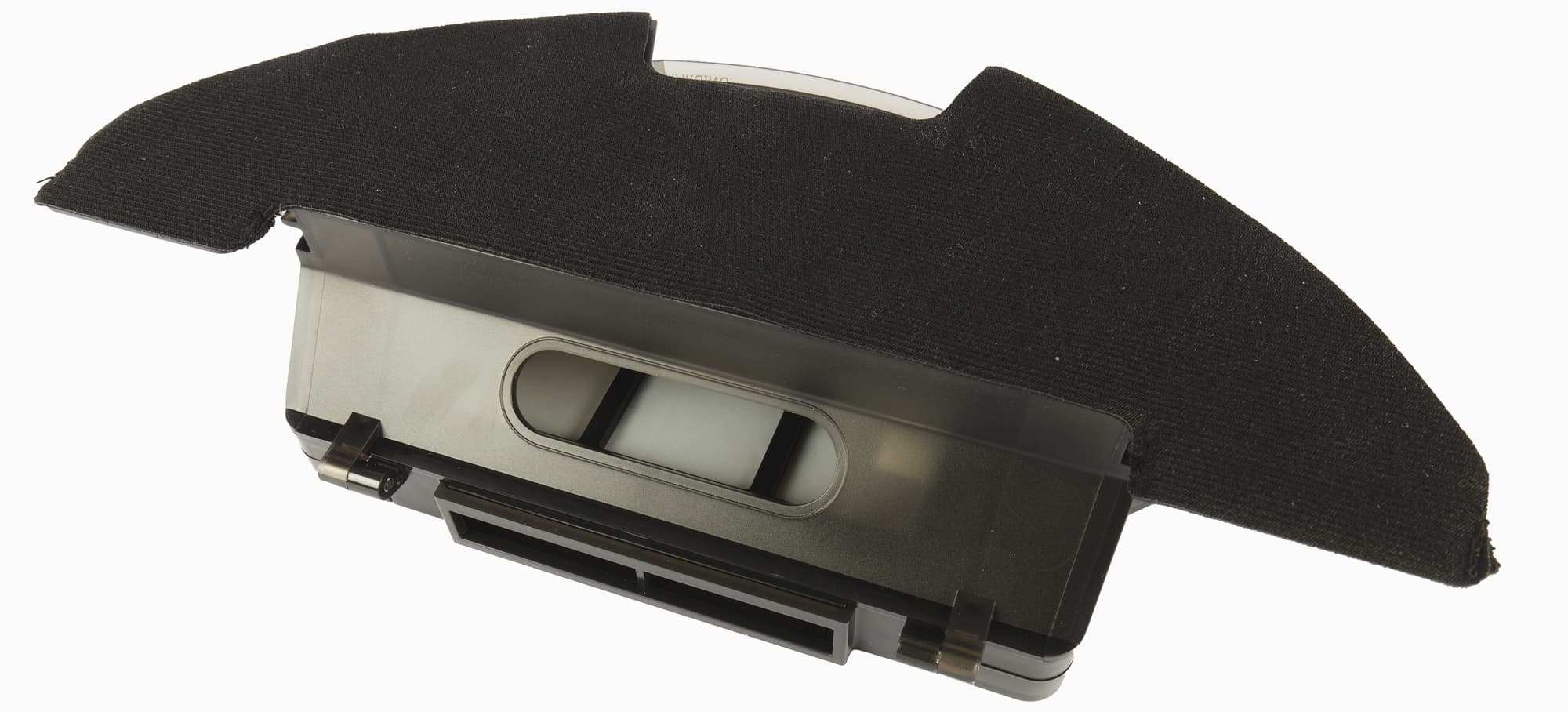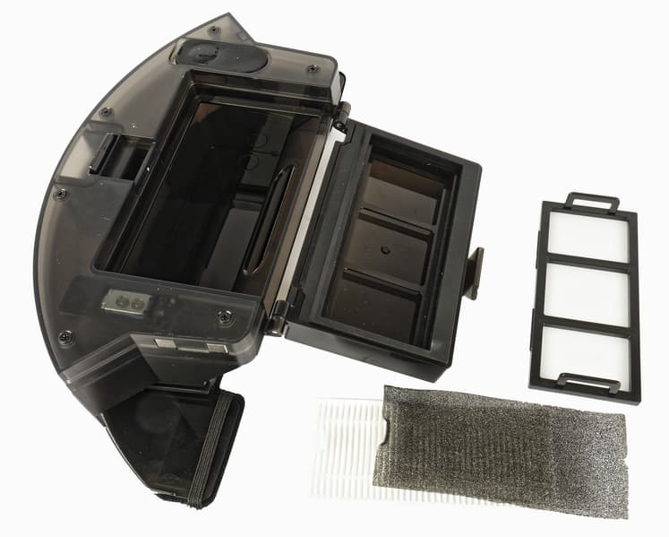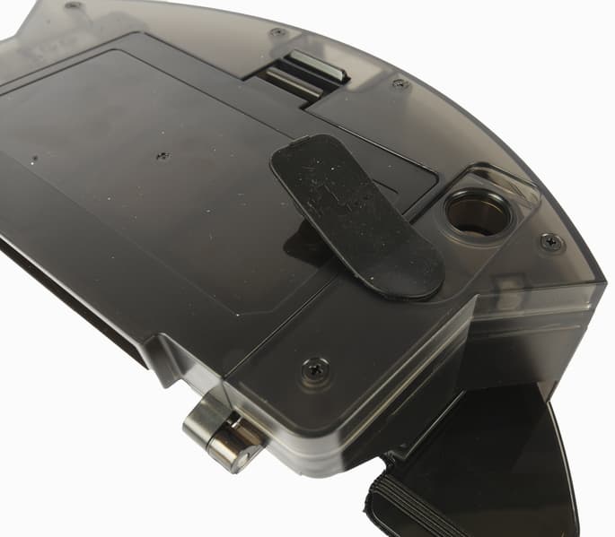 Блок для сухой и влажной уборки закрепляется в отсеке в задней части корпуса. Он состоит из мусоросборника с системой фильтров, резервуара для воды и рамки, на которой крепится микрофибровая тряпка для мытья пола.