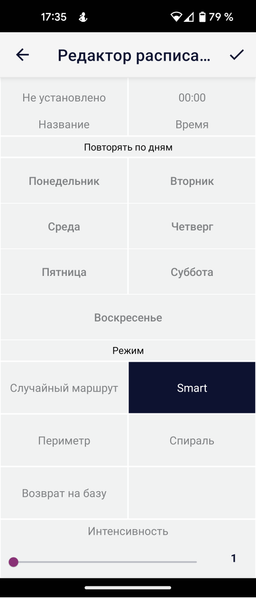 На странице редактора расписаний есть возможность назначить уборку в выбранное время нужного дня недели, задать тип маршрута (случайный, автоматический, уборка по периметру или спирали) и установить мощность всасывания, названную здесь интенсивностью.