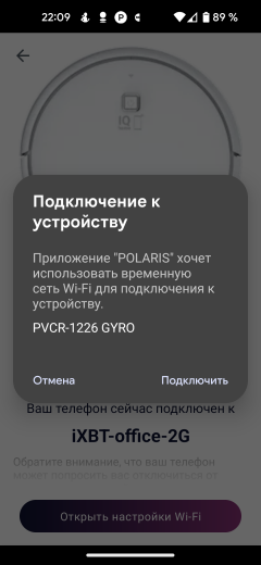 После длинного нажатия на кнопку управления пылесос входит в режим обнаружения и создает временную Wi-Fi-сеть. Приложение на короткое время переключается на нее и загружает в робота сведения о нашей основной сети. Еще секунд двадцать — и процесс настройки закончен.