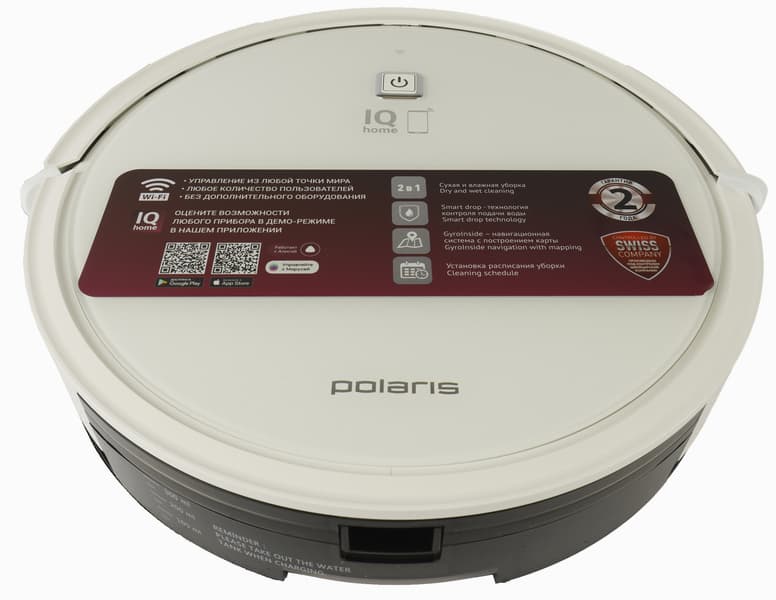 Как и подавляющее большинство роботов-пылесосов, Polaris PVCR 1226 круглый. Его белый корпус из гладкого пластика украшен легко снимающейся наклейкой с краткой информацией о приборе. Помимо основных сведений на наклейке есть QR-коды для установки ПО для Android и IOS — при распаковке можно сразу же установить нужное приложение.