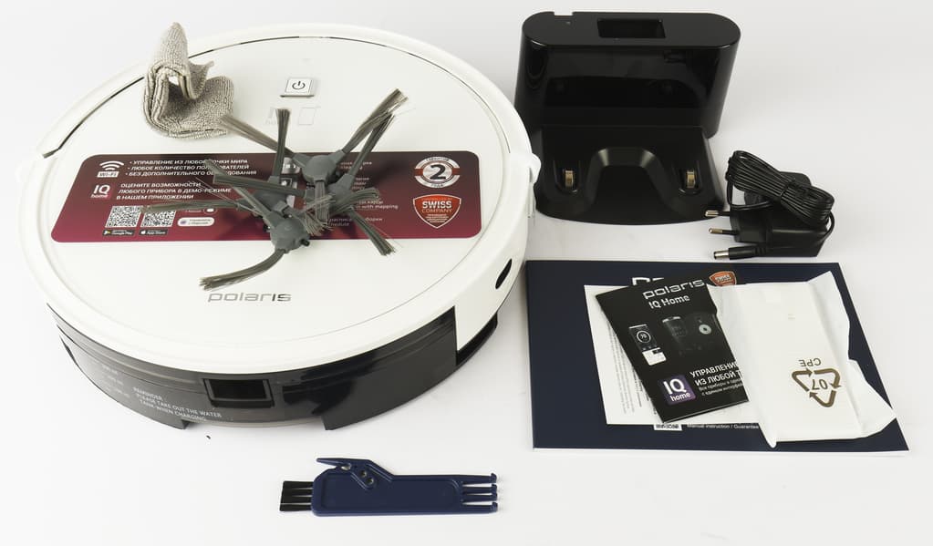 В комплект робота входит также несложное приспособление для ухода, состоящее из щетки для чистки мусоросборника, гребенки для прочистки HEPA-элемента и лезвия для срезания ниток и волос, которые могут намотаться на боковые и среднюю щетки.