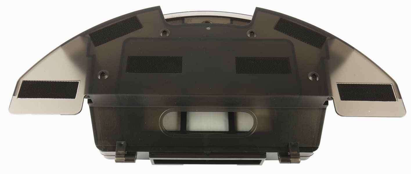 Крышка мусоросборника удерживается защелкой и откидывается более чем на 180° — это облегчает опорожнение резервуара. Система фильтрации состоит из капроновой сетки, натянутой на пластиковую рамку, поролонового элемента и прямоугольного HEPA-фильтра.