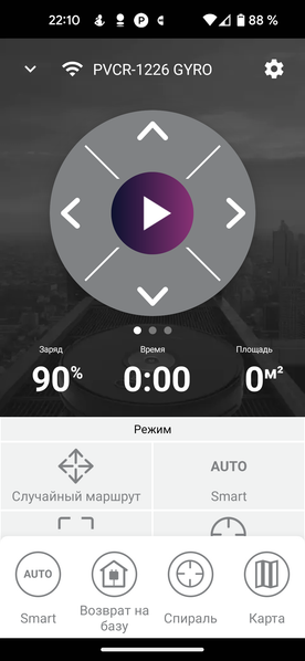 На главной странице приложения находится виртуальный пульт. С его помощью можно управлять движением подключенного пылесоса, приостанавливать текущую уборку и запускать ее. В нижней части экрана расположены кнопки опций уборки.
