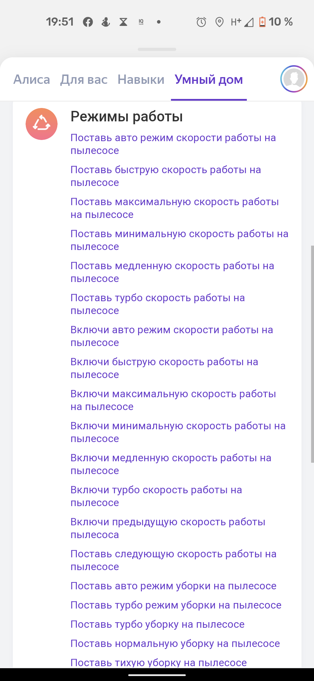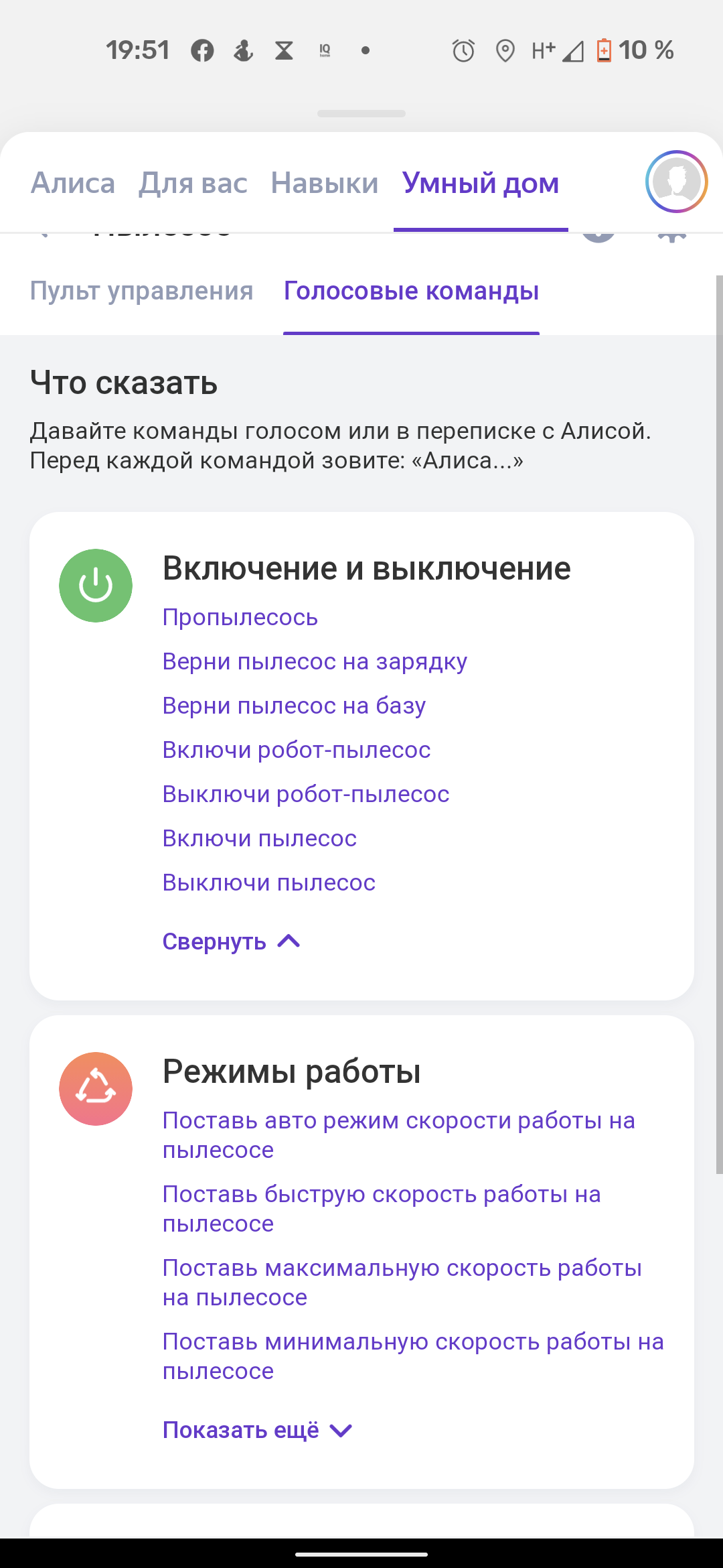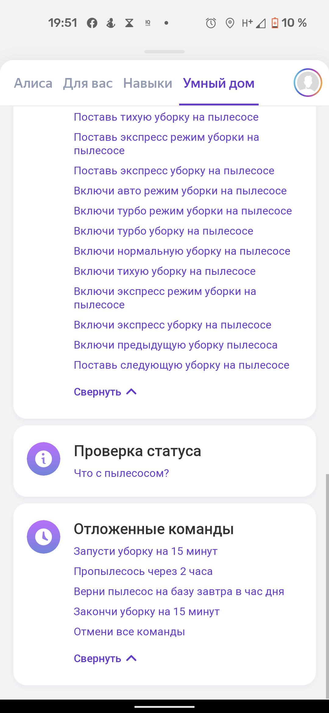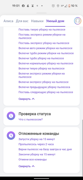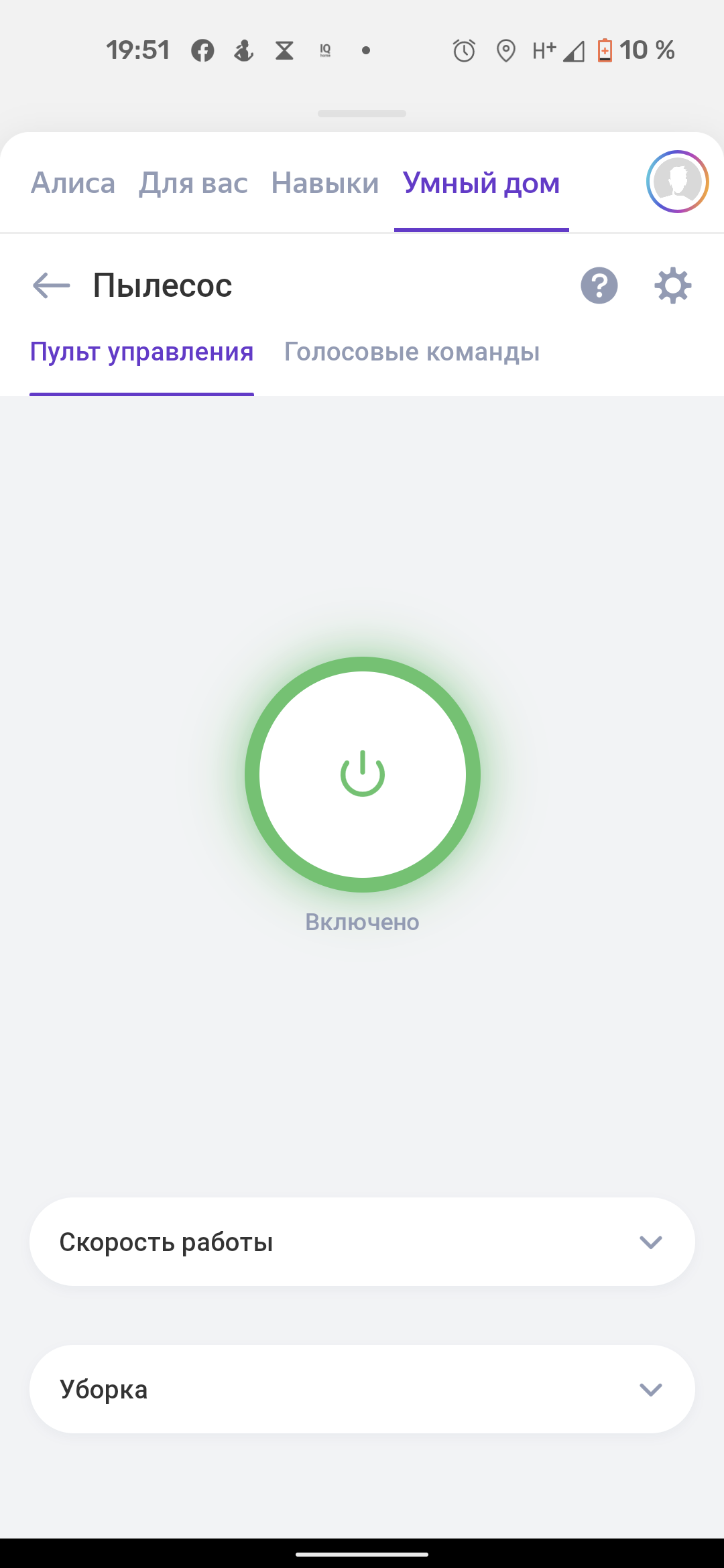 Проверили мы и заявленную производителем работу с голосовым помощником от Яндекса. Подключение пылесоса к «Алисе» прошло быстро и гладко: достаточно найти в списке «навыков» плагин Polaris — и приложение само синхронизирует наше устройство с ассистентом. От пользователя требуется только указать, в какой комнате будет работать пылесос, и выбрать ему псевдоним. На главном экране плагина появляется виртуальный пульт управления, с помощью которого можно запустить автоматическую уборку. Но главное в «Алисе», конечно, — голосовое управление.