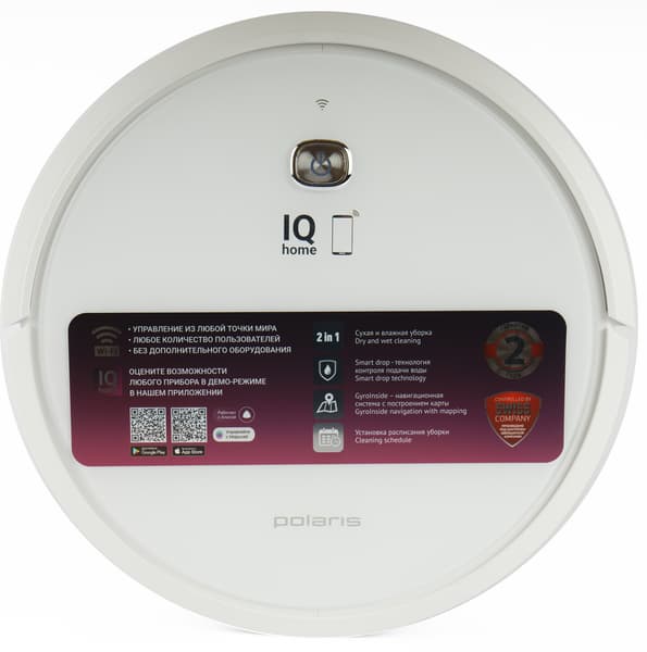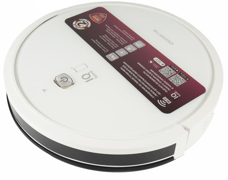 Пылесос круглый, как и подавляющее большинство роботов. Его верхняя панель сделана из матового белого пластика. На ней мы видим единственную кнопку управления, логотип производителя и значок экосистемы Polaris IQ Home. Рекламная наклейка на панели наклеена качественно и отделяется с трудом.