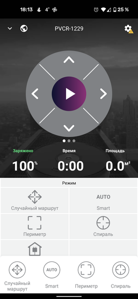 На главной странице приложения находится виртуальный пульт управления, с помощью которого можно управлять движением подключенного пылесоса, приостанавливать текущую уборку и запускать ее. В нижней части экрана расположены кнопки опций уборки.