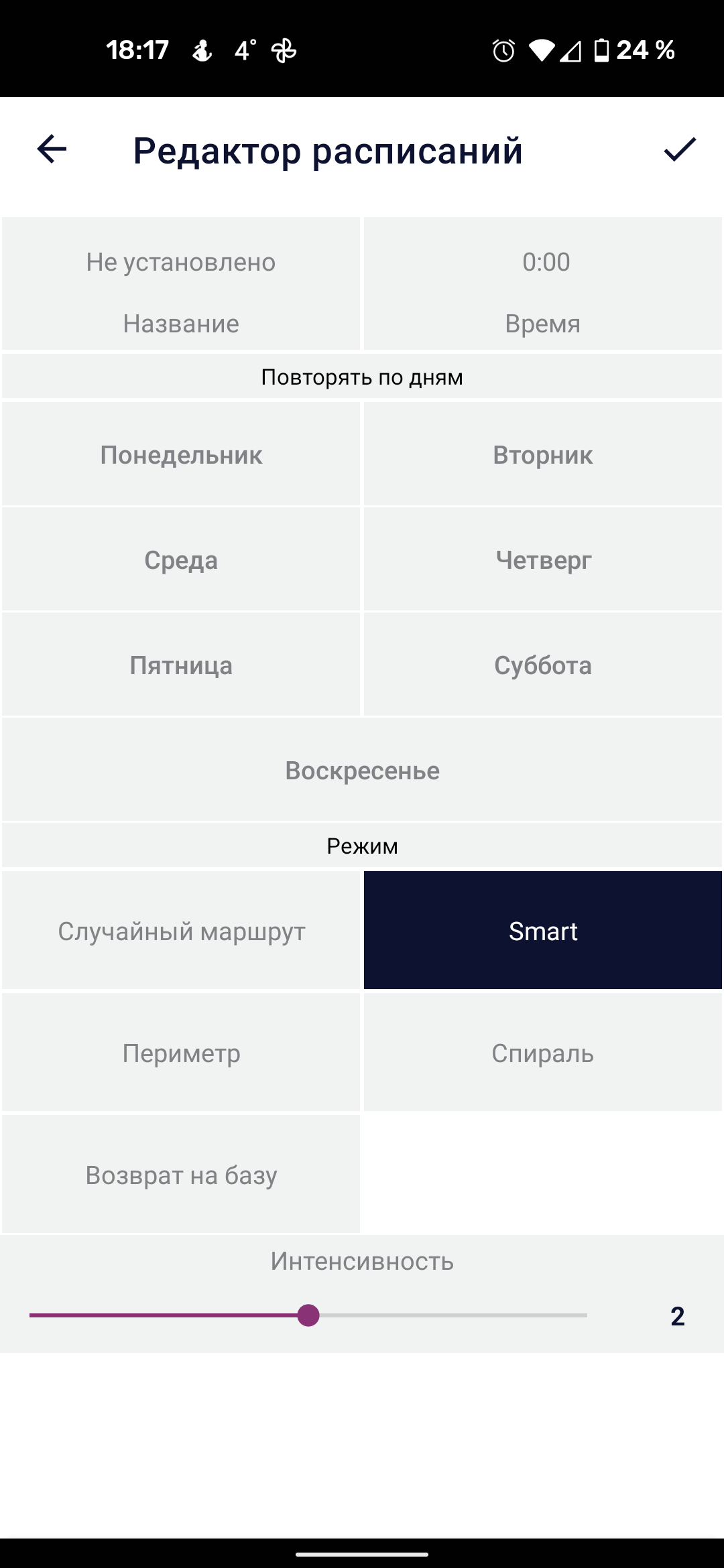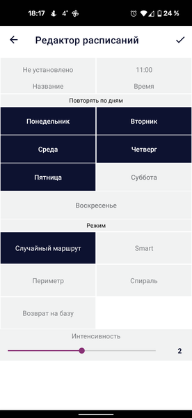 На странице редактора расписаний приложение дает возможность назначить уборку в выбранное время нужного дня недели, задать тип маршрута (случайный, автоматический, уборка по периметру или спирали) и установить мощность всасывания, названную здесь интенсивностью.