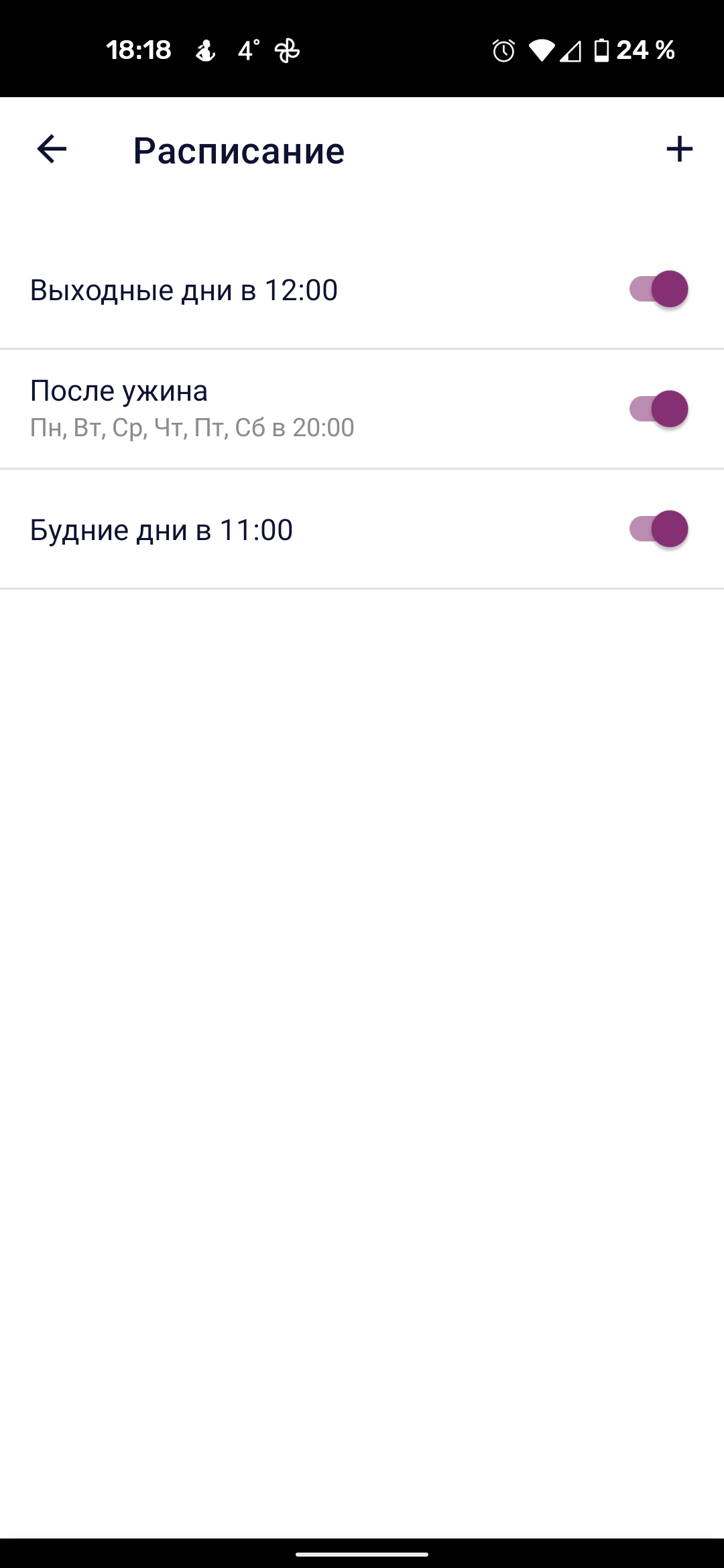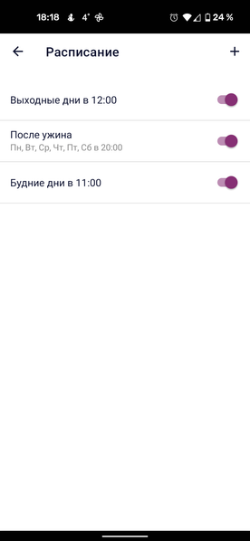 Нам показалось удобным настроить утреннюю уборку по будням в одиннадцать утра, по выходным — в полдень (в субботу и воскресенье мы любим поспать подольше), а вечернюю — в двадцать часов.