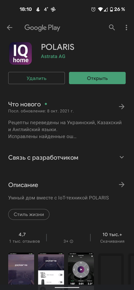 Для объединения умной бытовой техники в единую экосистему компания предлагает одноименное приложение. На момент написания обзора рейтинг программы составил 4.7 (свыше тысячи отзывов, более 10 тысяч скачиваний) — это весьма высокая оценка. Мы, признаться, тоже любим приложение Polaris и регулярно его используем в повседневной жизни.