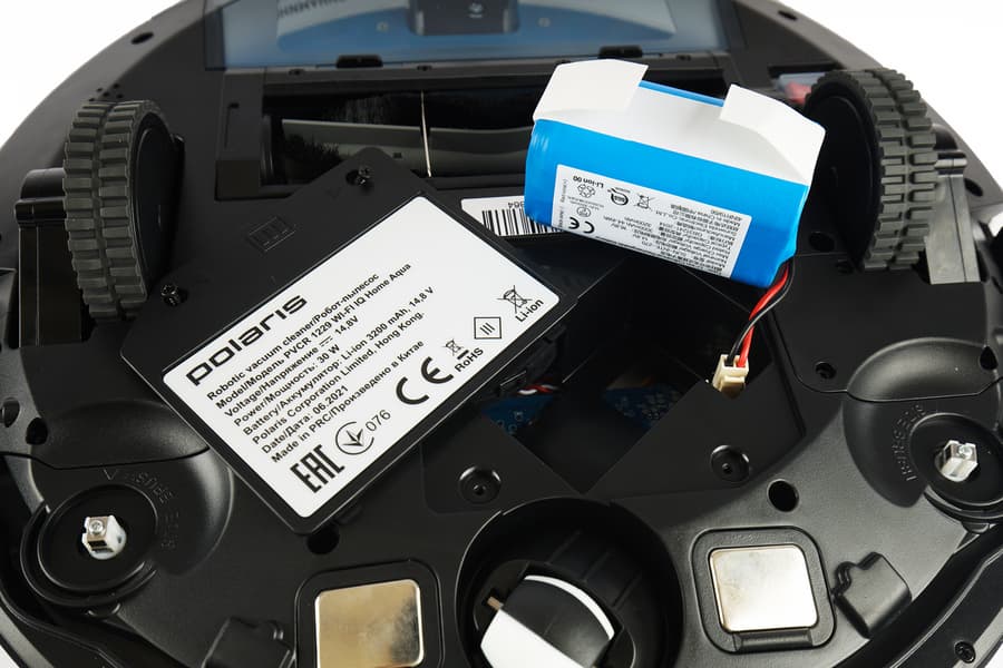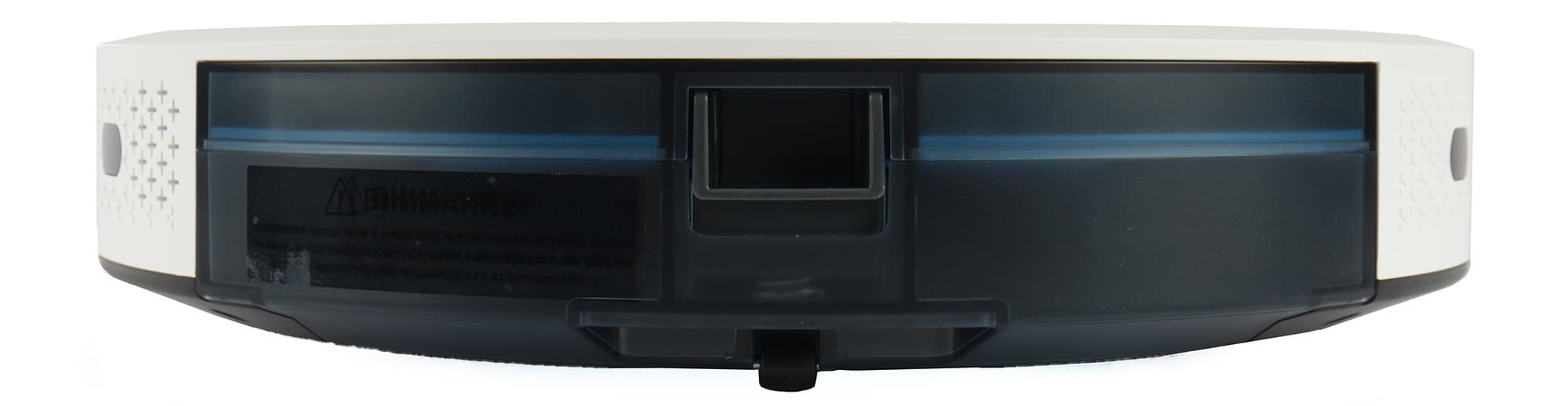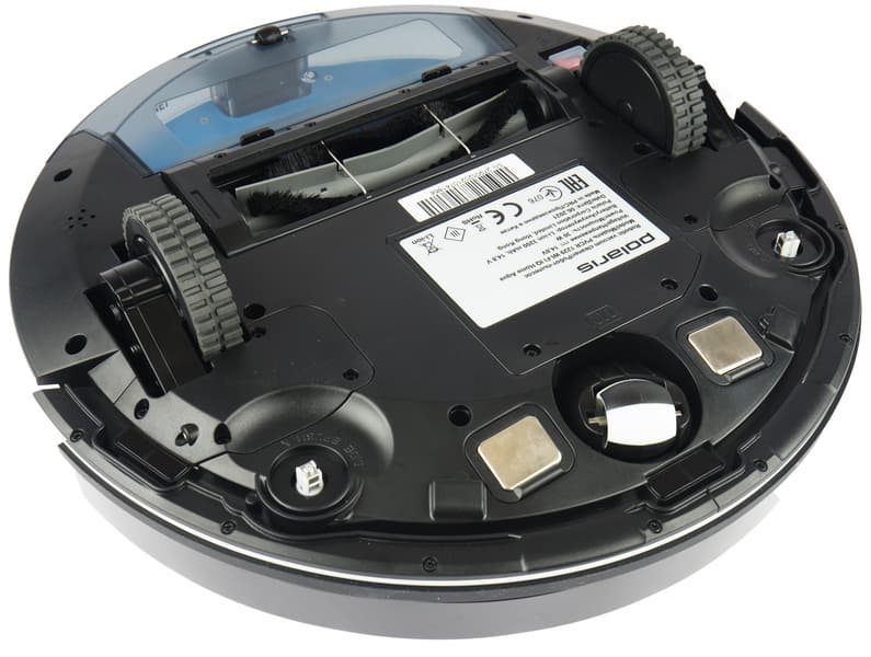 Под бампером располагаются три пары датчиков поверхности: они позволяют пылесосу избегать падения с высоты — к примеру, с лестниц. По бокам от направляющего колеса — два контакта для зарядки на базе, а за колесом находится крышка аккумуляторного отсека, закрепленная на винтах с крестообразной головкой.