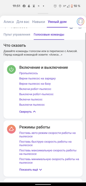 Производитель предоставляет богатейшие возможности по управлению устройством через голосовое API: список возможных команд с трудом помещается на экране смартфона.