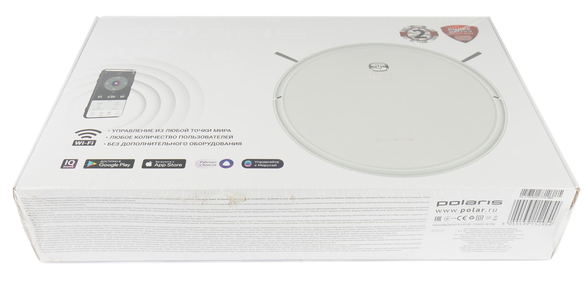 Робот-пылесос Polaris PVCR 1229 Wi-Fi IQ Home Aqua упакован в белую картонную коробку с полноцветной печатью. Помимо фотографии устройства, как это принято, на лицевую сторону производитель вынес коммуникационные достоинства модели: управление из любой точки мира любым количеством пользователей. Подчеркивается, что для этого не требуется дополнительного оборудования (наличие мобильного телефона и доступа к сети Wi-Fi, вероятно, не в счет).