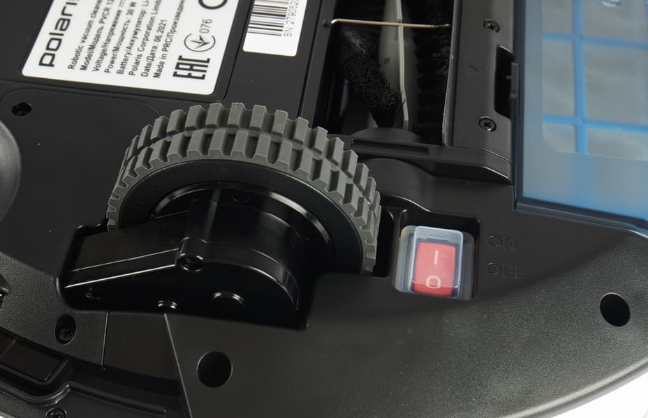 Тумблер включения пылесоса размещен за правым ведущим колесом и защищен от пыли и повреждений несъемным силиконовым колпачком.