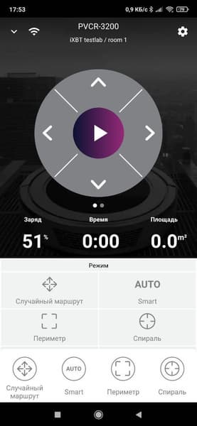 За первые 10 минут PVCR-3200 обошел практически всю тестовую площадку, один раз посетив «ловушку» в левом дальнем углу и успешно выбравшись из нее, а также прогулявшись вдоль стен. В самом начале уборки произошла стандартная для роботов-пылесосов ситуация: прибор слегка запутался между препятствием и «виртуальной стеной», которую создает вокруг себя базовая станция, но вскоре догадался обойти препятствие и продолжить уборку.