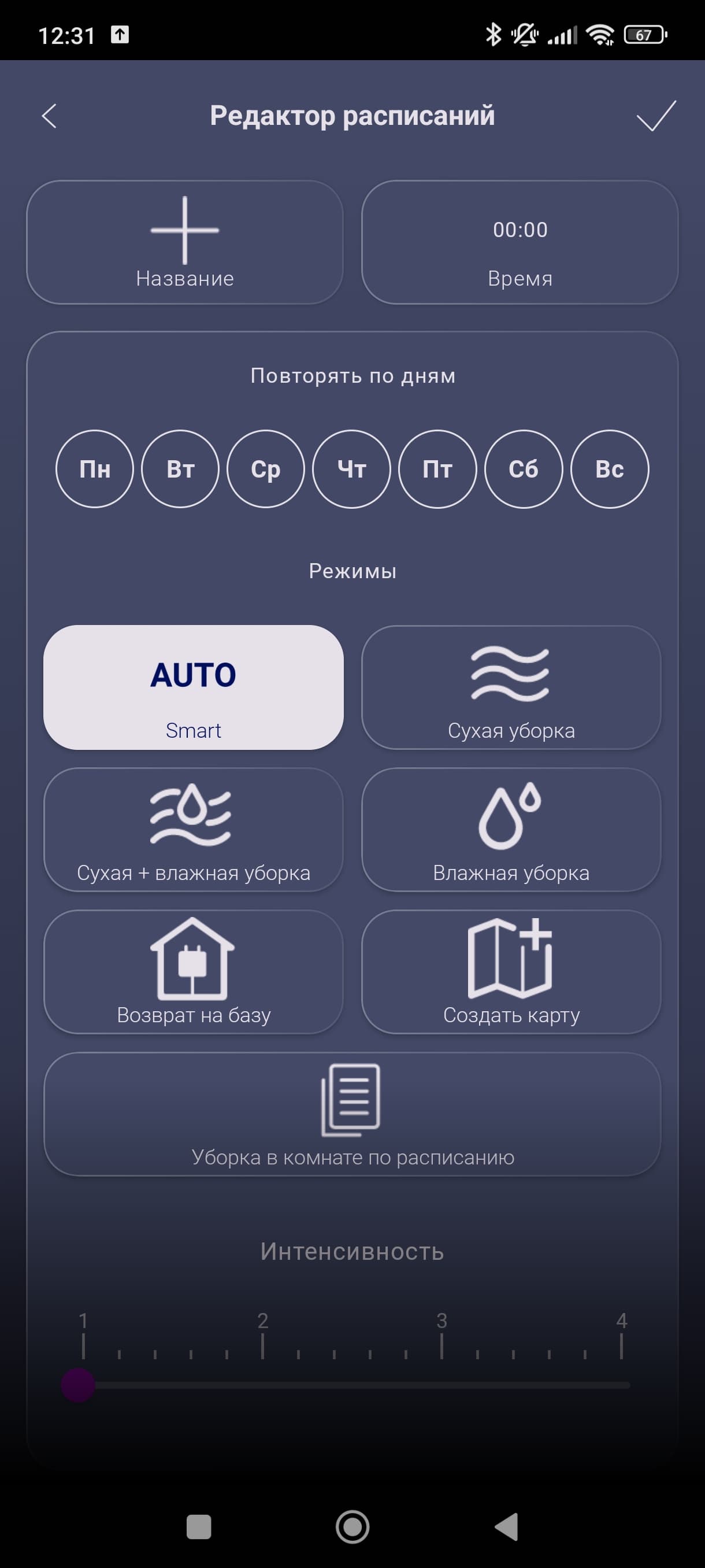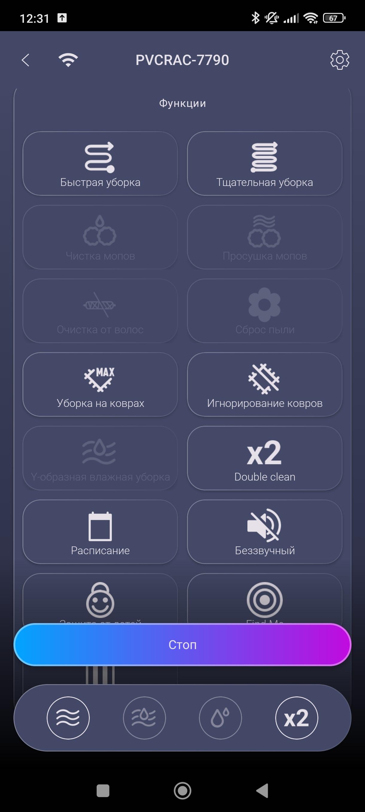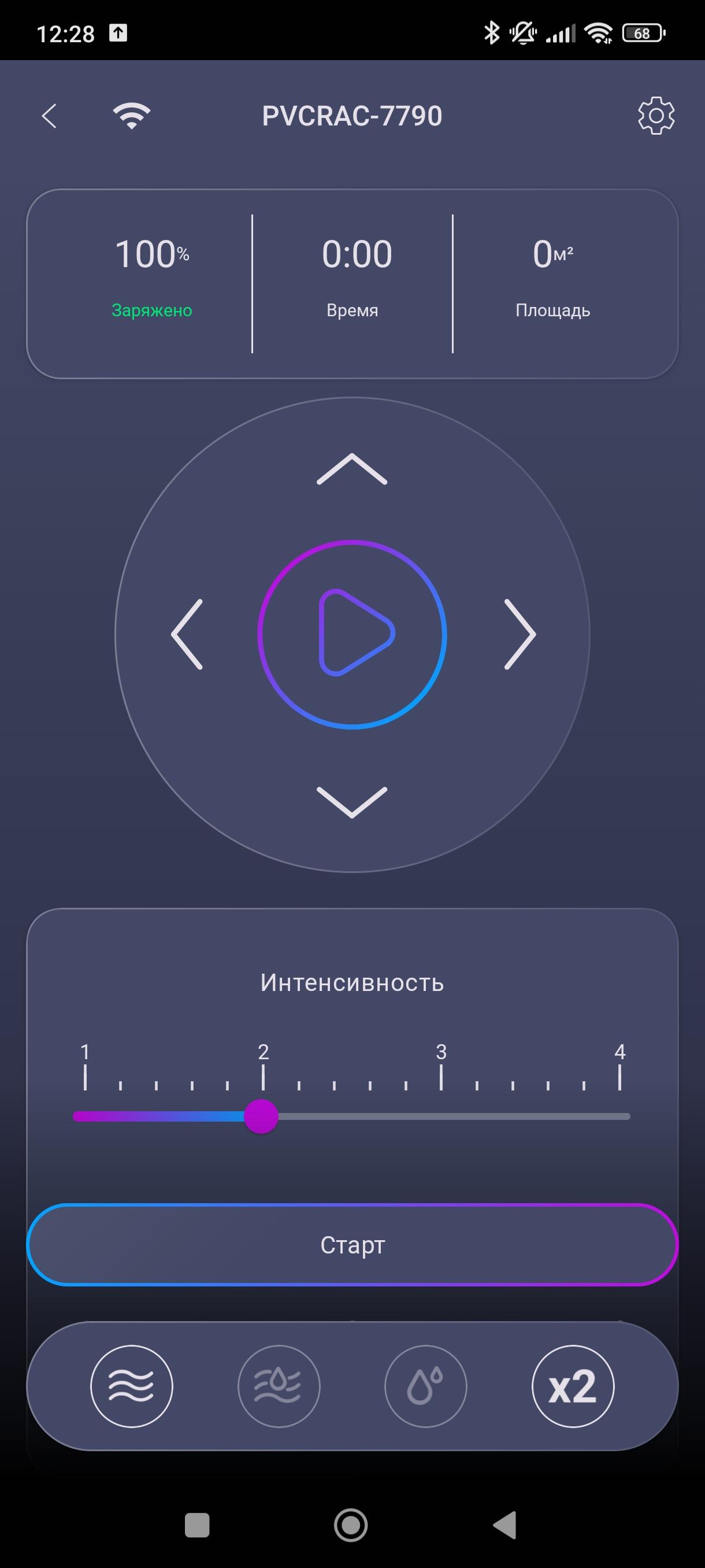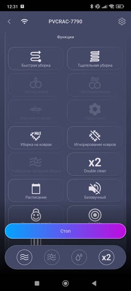 Ниже находятся настройки интенсивности всасывания и подачи воды, а под ними — кнопки различных режимов.