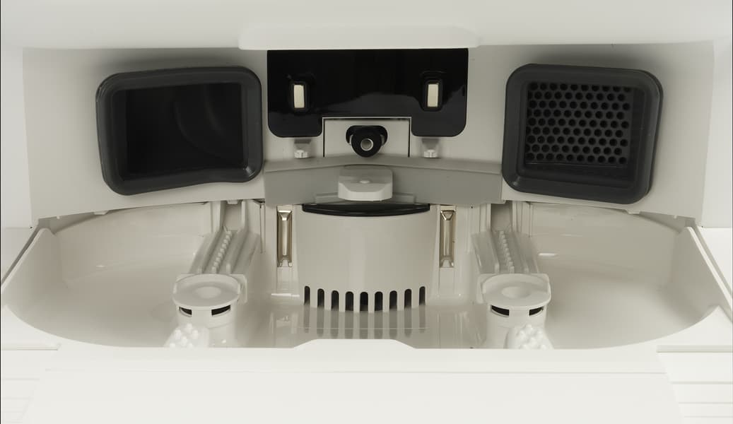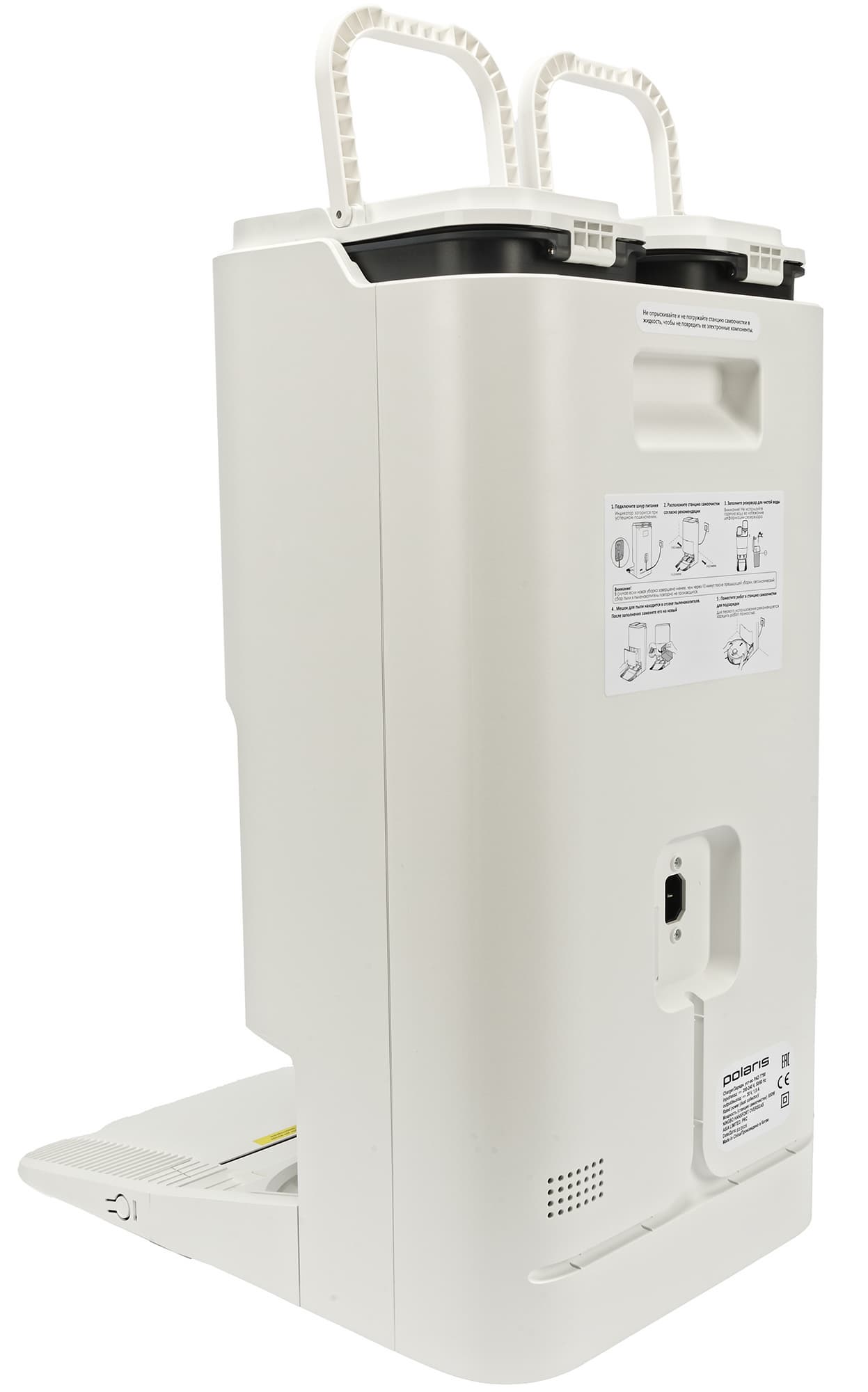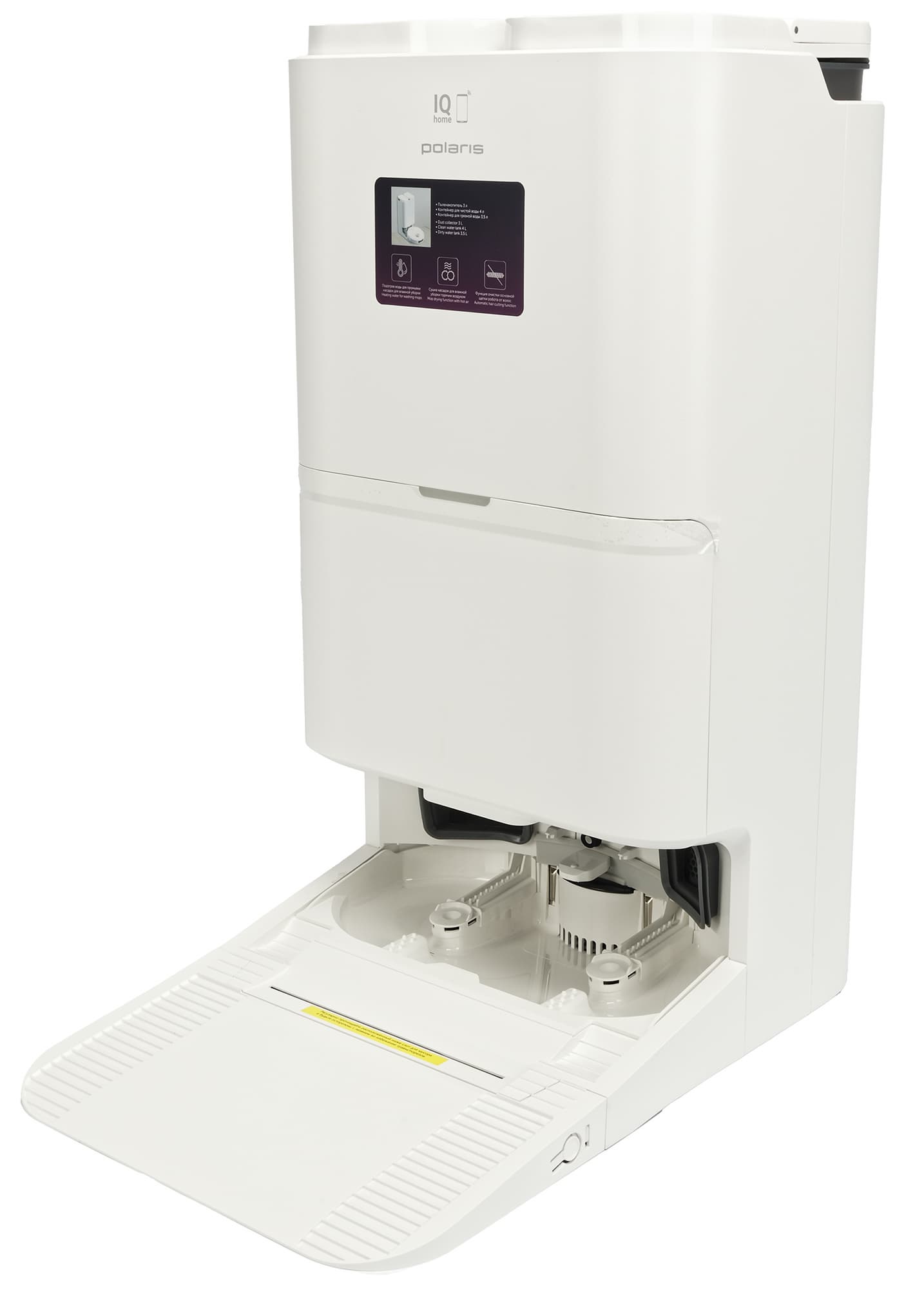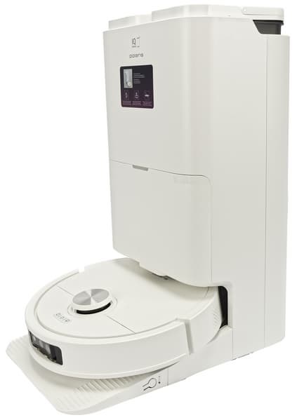 Базовая станция оборудована большой консолью для заезда робота. По центру парковочной ниши расположены контакты для зарядки, по бокам — два отверстия, через которые происходит самоочистка (сброс мусора). Между зарядными контактами — разъем автоматической дозаправки пылесоса чистой водой. Снизу — решетка для подачи теплого воздуха (сушки салфеток).