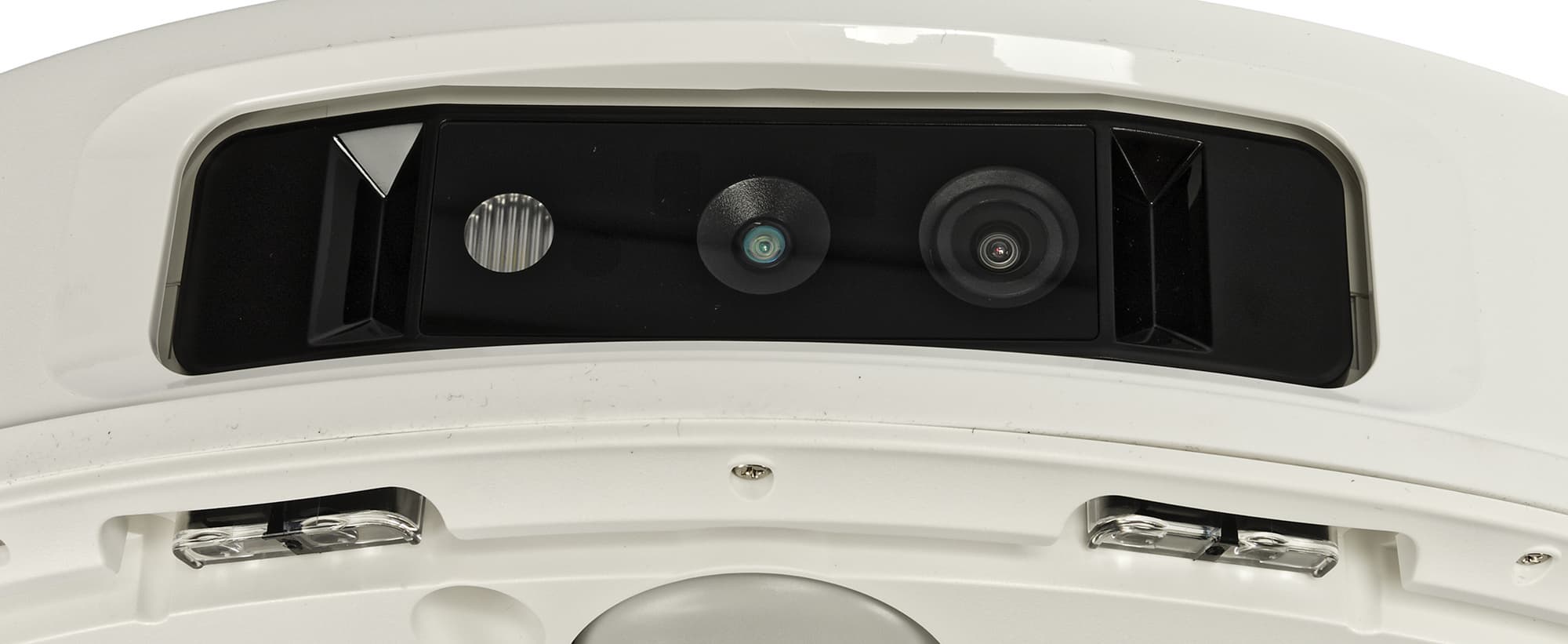 Спереди, как водится, у робота установлен подвижный бампер (он же — физический датчик столкновений). У более бюджетных моделей бампер оснащен лишь инфракрасными сенсорами, а у нашей модели между ними расположилась видеокамера, в том числе выполняющая роль интеллектуального сенсора. «Объектива» тут два (при съемке видео задействован один, мы проверили) плюс светодиод для подсветки рабочей зоны (она включается в условиях недостаточной освещенности). Назначение третьего элемента достоверно установить нам не удалось (инструкция скромно называет все это «датчик обнаружения препятствий»).