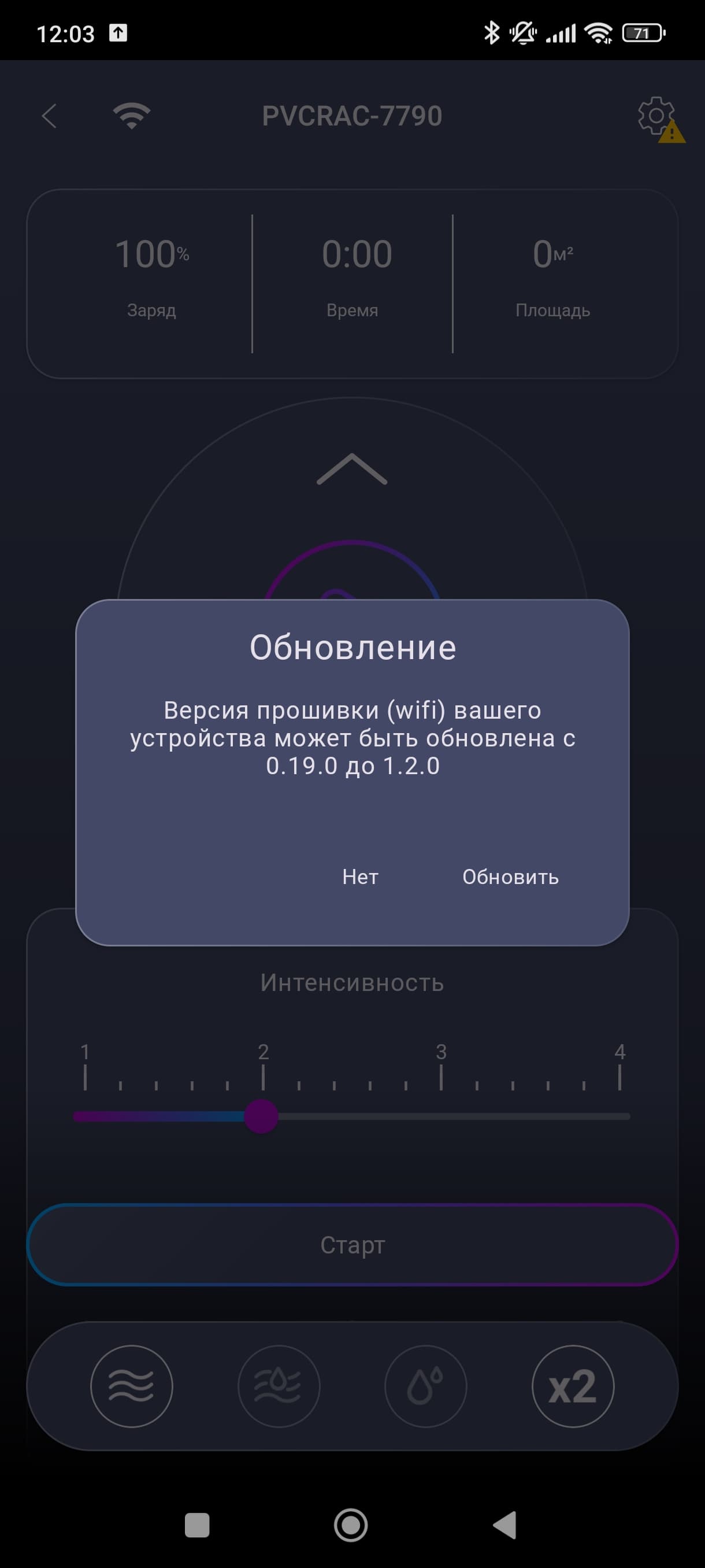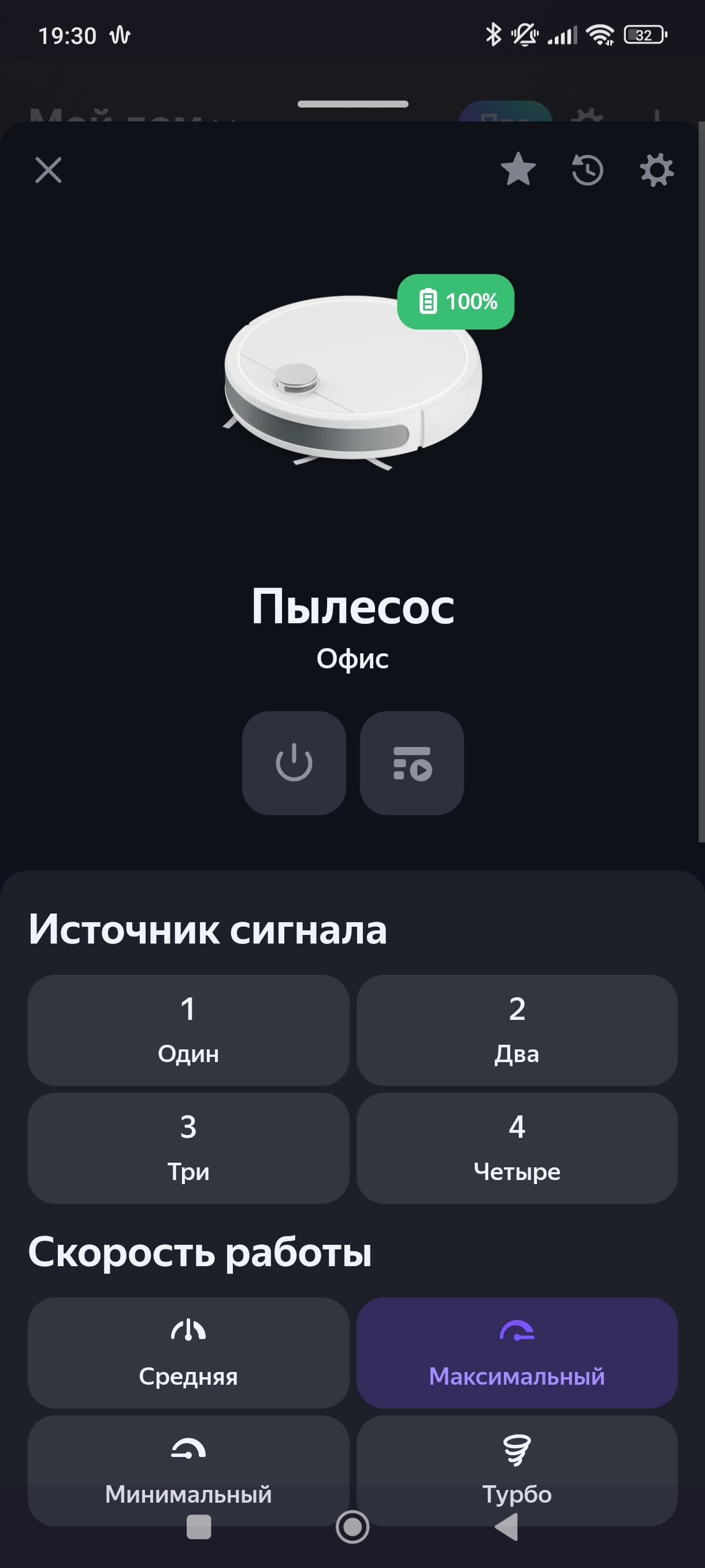 На главном экране нас встречает «пульт» позволяющий настроить скорость работы (мощность всасывания), а также включить и отключить беззвучный режим.