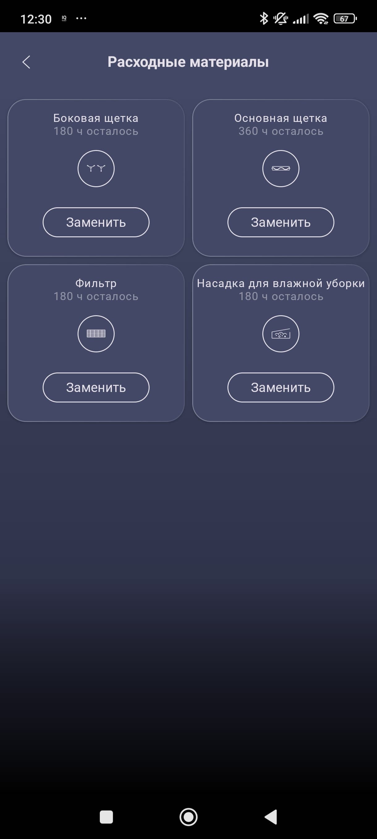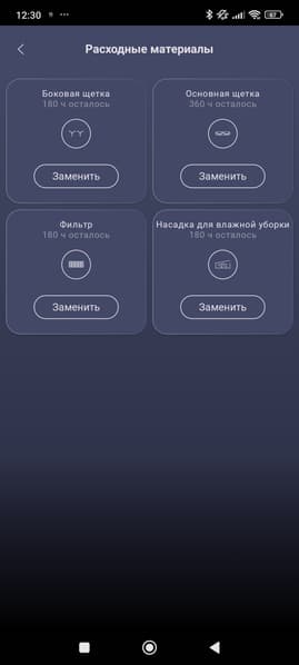 В приложении можно фиксировать этапы обслуживания устройства — время очистки контейнера для пыли, очистки фильтра, замены боковой или основной щетки, после чего на экране смартфона можно будет следить за износом расходных материалов (вычисляется в рабочих часах) и примерно понять, когда они потребуют внимания пользователя.