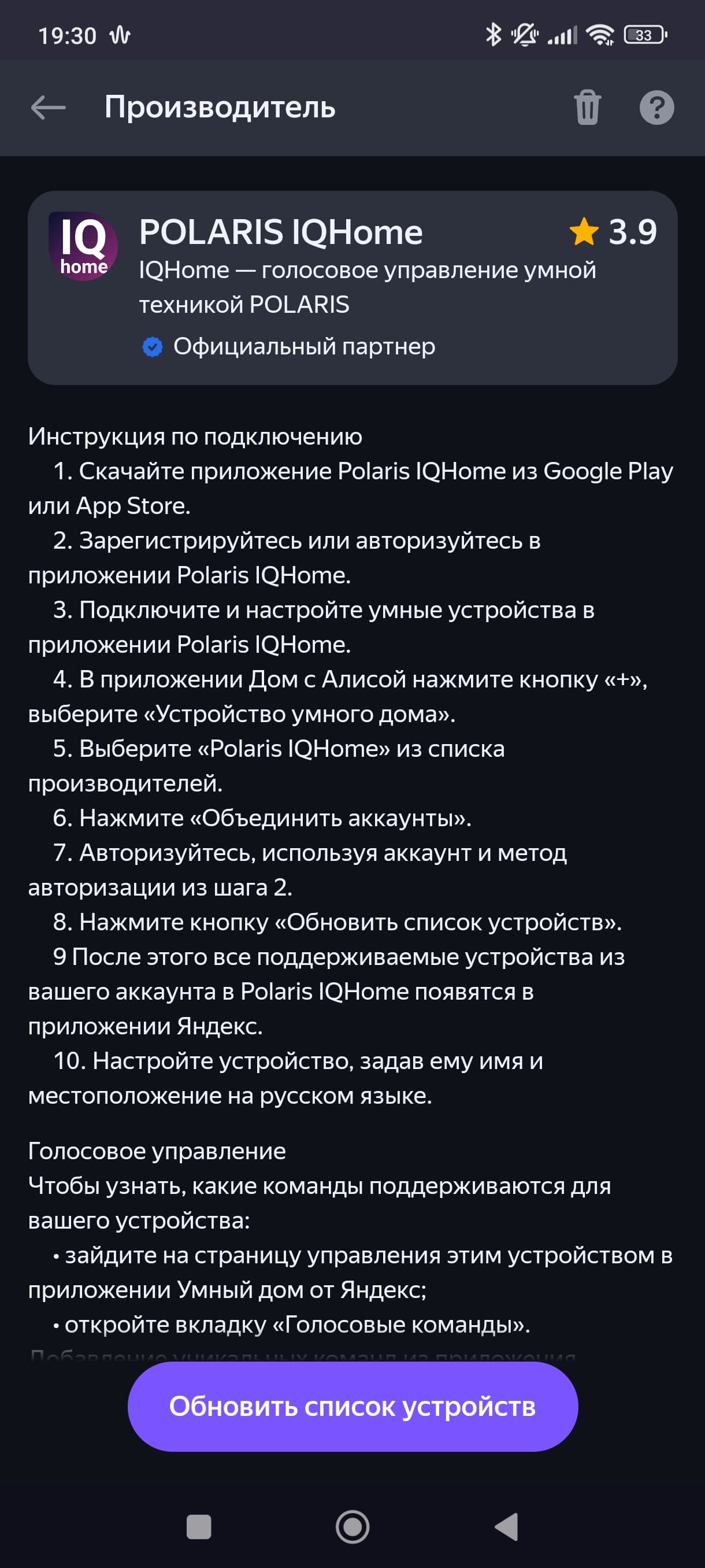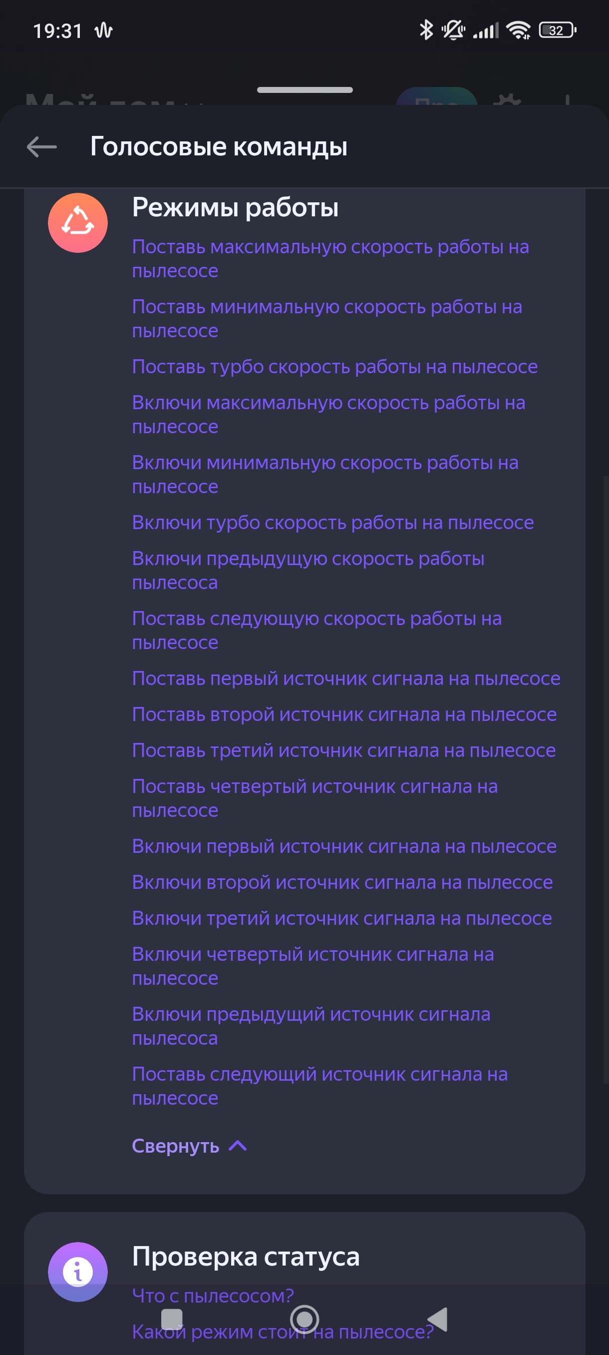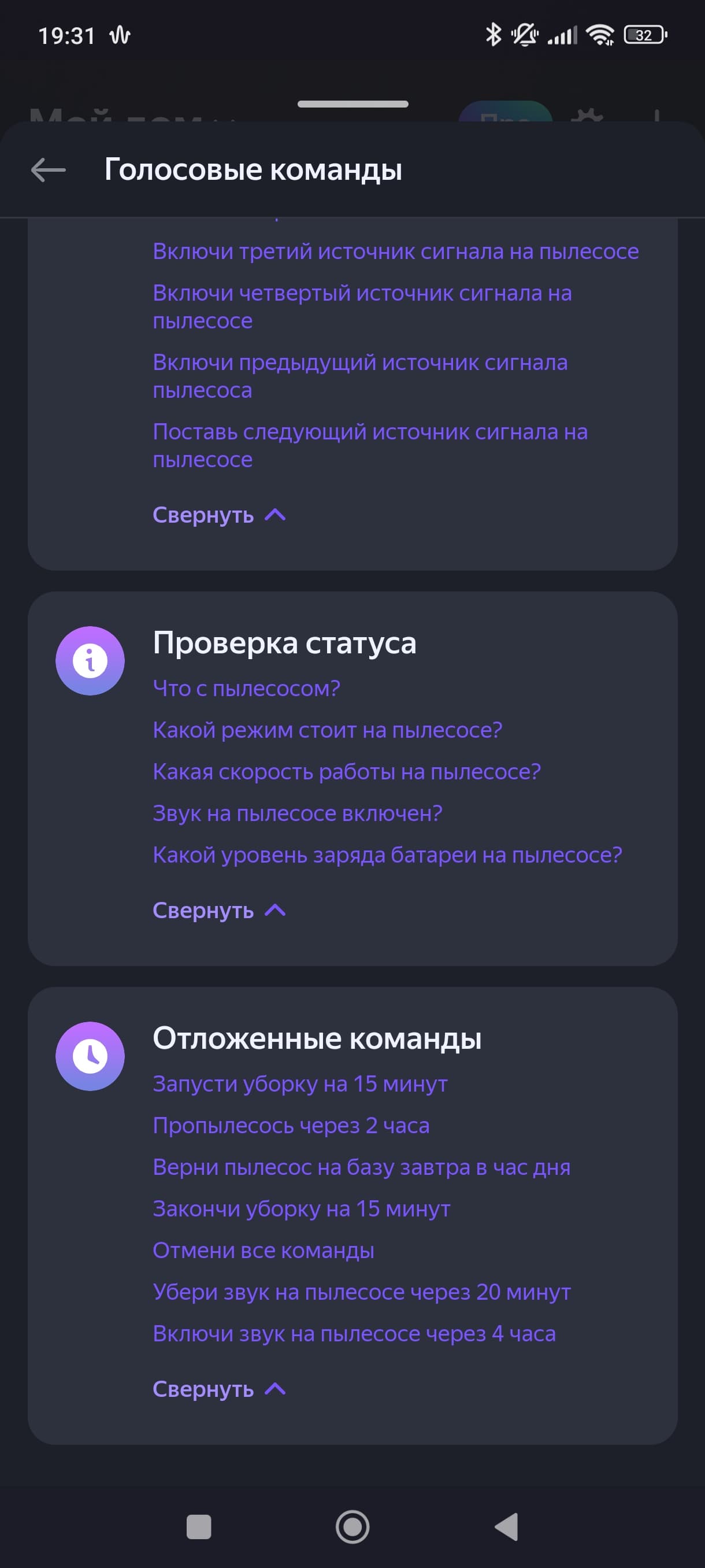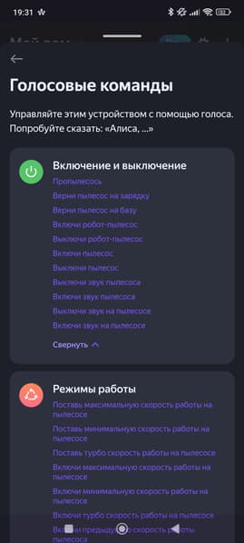 Если открыть список голосовых команд, то мы можем оценить все возможности голосового управления. И снова видим загадки типа «Поставь третий источник сигнала на пылесосе». Команд, отвечающих за влажную уборку, мы также не обнаружили.